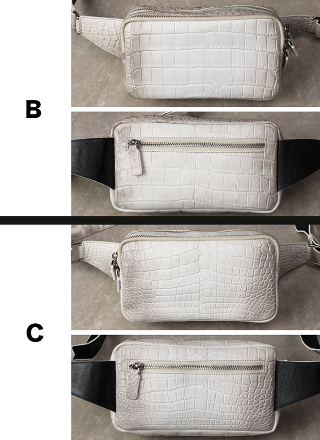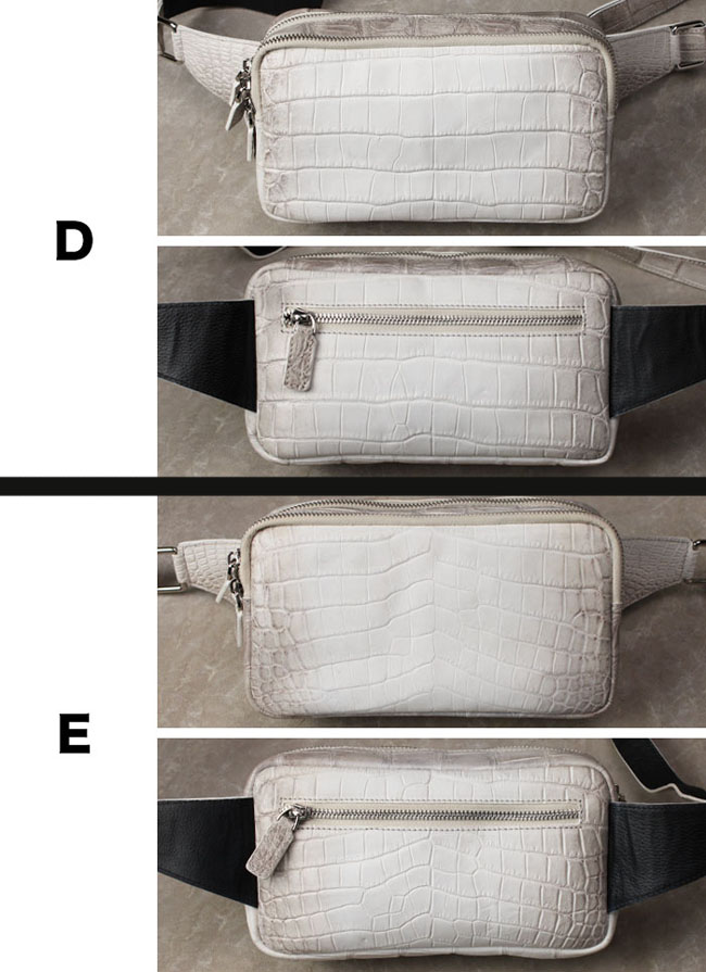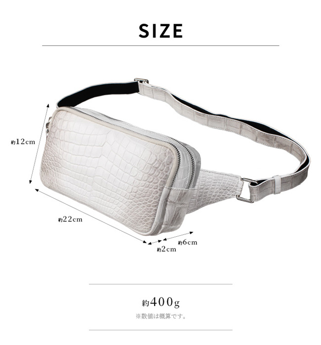 クロコダイルを贅沢に使用した、両手が空きハンズフリーで便利な斜めがけ/ボディバッグです。ヒマラヤクロコダイルの上品な白色が美しいです。 バッグ全体(表面)にヒマラヤクロコダイルのベリー(お腹部分)を使用しています。シットリとしたマットな仕上がりで肌触りが柔らかく、高級感のある贅沢なバッグに仕上がっています! ジッパーは左右に大きく開きますので内容物を取り出し易く便利です。内張は牛革でしっかりしたつくりです。バック部分は二層になって前後に収納スペースがあります。スマホ、財布、タバコなど、いつも持ち歩く日常品がすっきり収納できます。アイテムに合わせて収納してください。 メインルームの内側とバッグ裏側にジッパー付きポケットが付いています。隠しポケットとして貴重品入れに最適です。 ショルダーベルトの長さ調整可能です。ボディバッグとして制作していますのでショルダーベルトは長めとなり、取り外しは出来ません。 |