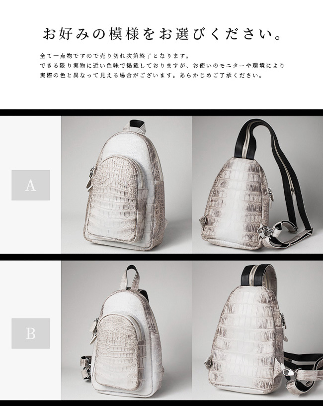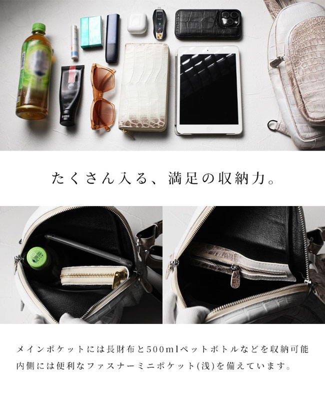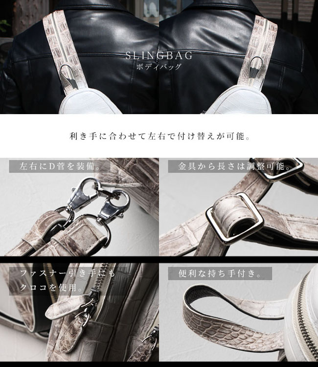 | 製品名 | ヒマラヤクロコダイル ボディバッグ スリング ショルダーバッグ 斜め掛け バッグ ワニ革 ホワイト/白 メンズ ベリー 本革 |