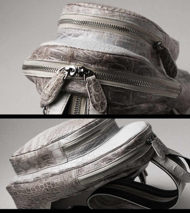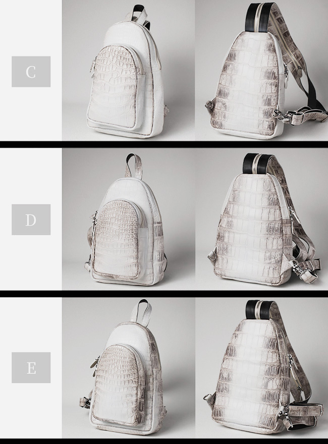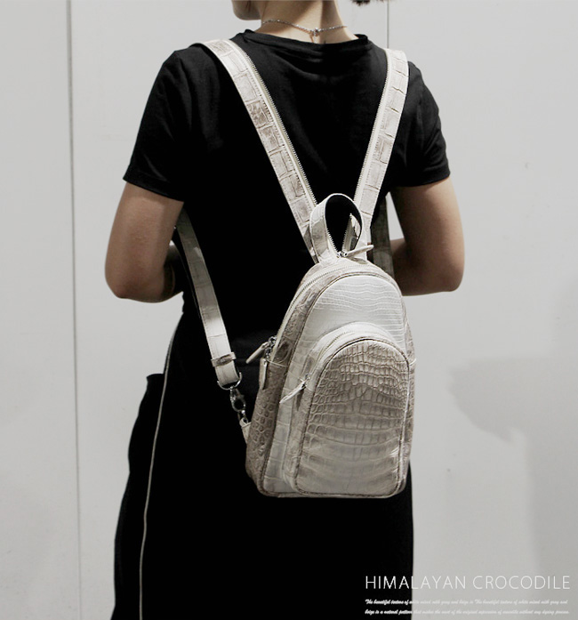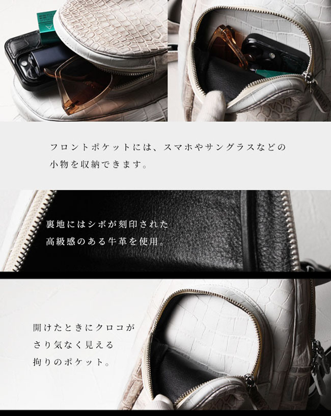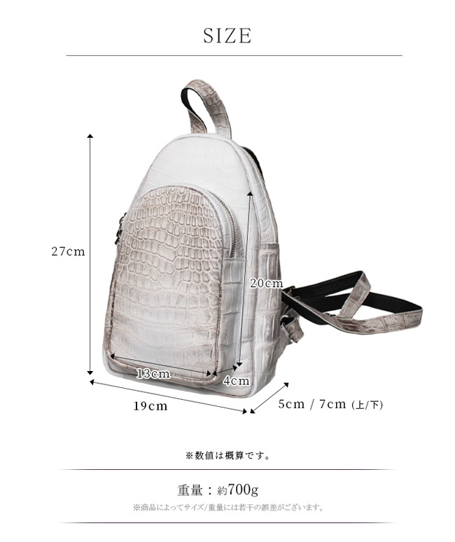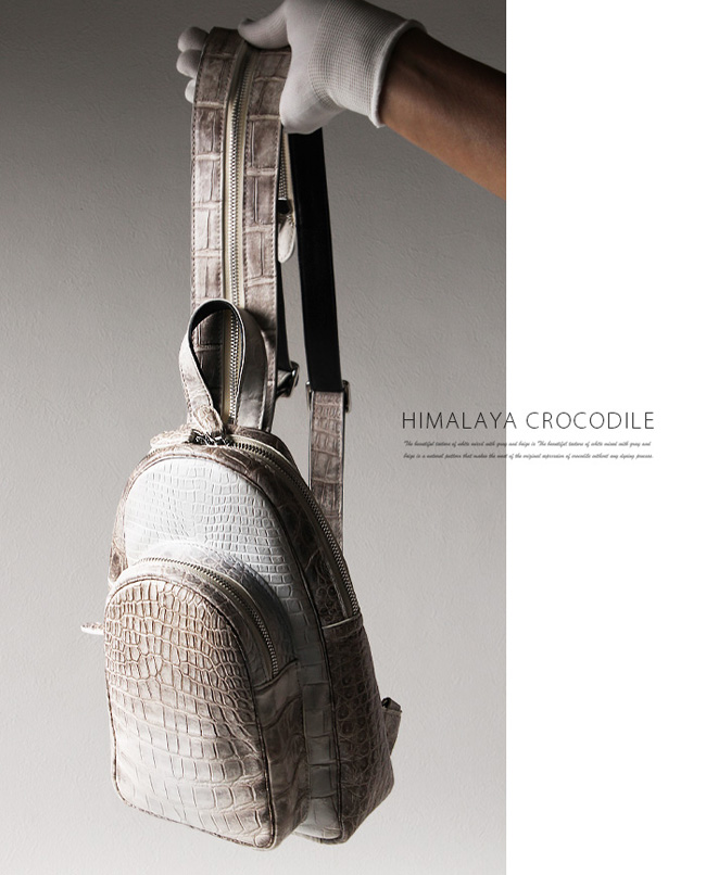 ヒマラヤ山脈の雪景色を思わせる、淡く美しいグラデーション。 その神秘的な表情を持つ「ヒマラヤクロコダイル」を、正面はもちろん、背面・側面・底面に至るまで惜しみなく使用。 1点に1匹以上のクロコダイルを贅沢に用いた、まさに芸術品レベルのレザーバッグです。 ホワイトとグレーが織りなす自然な色彩は、唯一無二の存在感。洗練された高級感と落ち着いた品格が共存し、持つ人の魅力を一層引き立てます。 スタイル自在の2WAY仕様となります。 ショルダーベルトのファスナー外して下部の左右D菅にストラップを装着することでリュックとして、ファスナーを閉めて下部どちらか片方のD菅にストラップを装着することで、利き手を選ばないボディバッグとしてお使いいただけます。 メインポケットは500mlペットボトルや長財布がすっぽり入るサイズ感。メインの内側にはファスナー式のミニポケットが備わっています。 フロントポケットにも小物を収納可能。しっかりと荷物を持ち運べる満足の収納力。 ※一点モノ商品として複数のサイトで販売しているため、購入のタイミングによる売り切れの場合は、予めご了承ください。 |