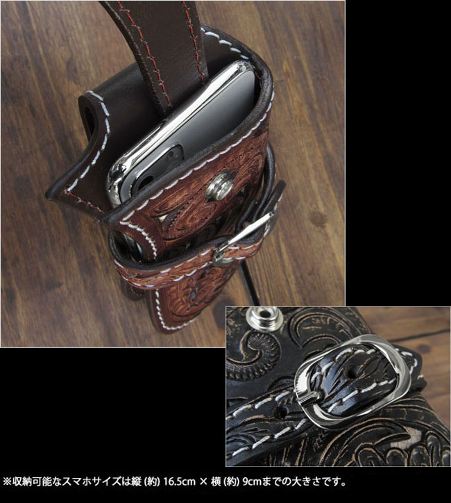 | 製品名 | カービング スマホ/iPhoneケース スマホホルダー 本革 ヌメ革 サドルレザー ナチュラル ダークブラウン ブラック3色 コンチョ付き Lサイズ |