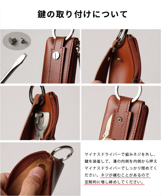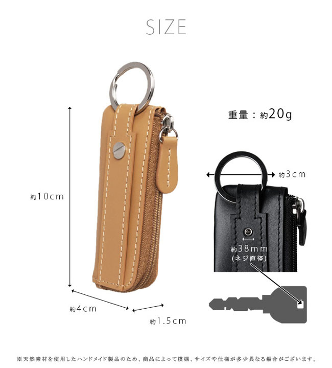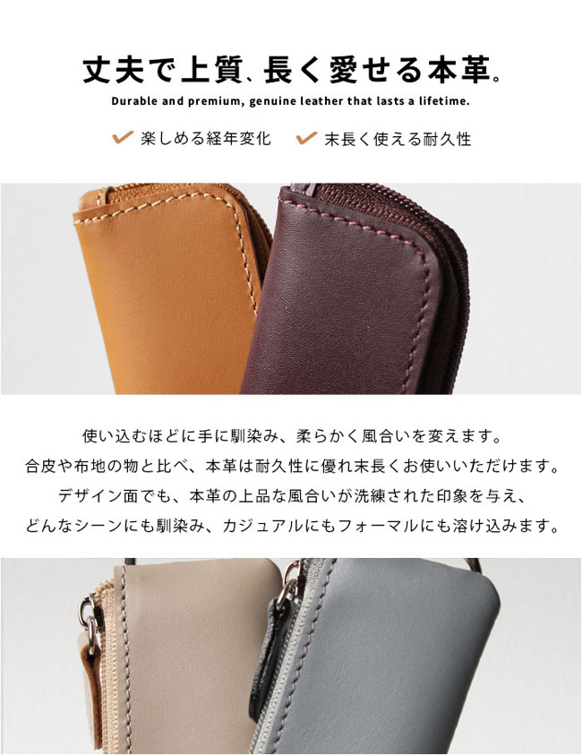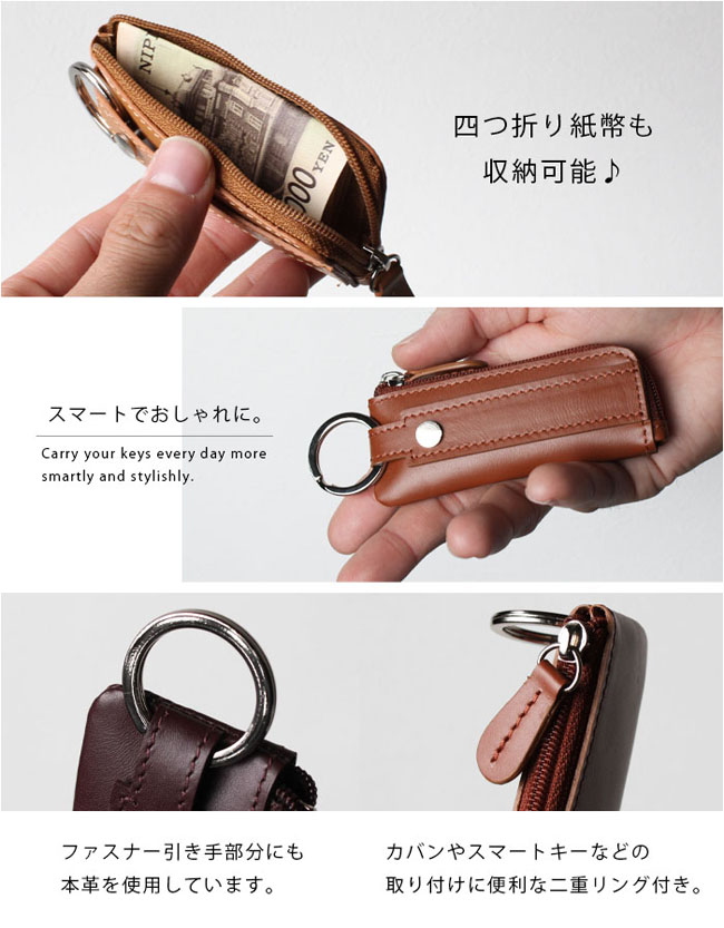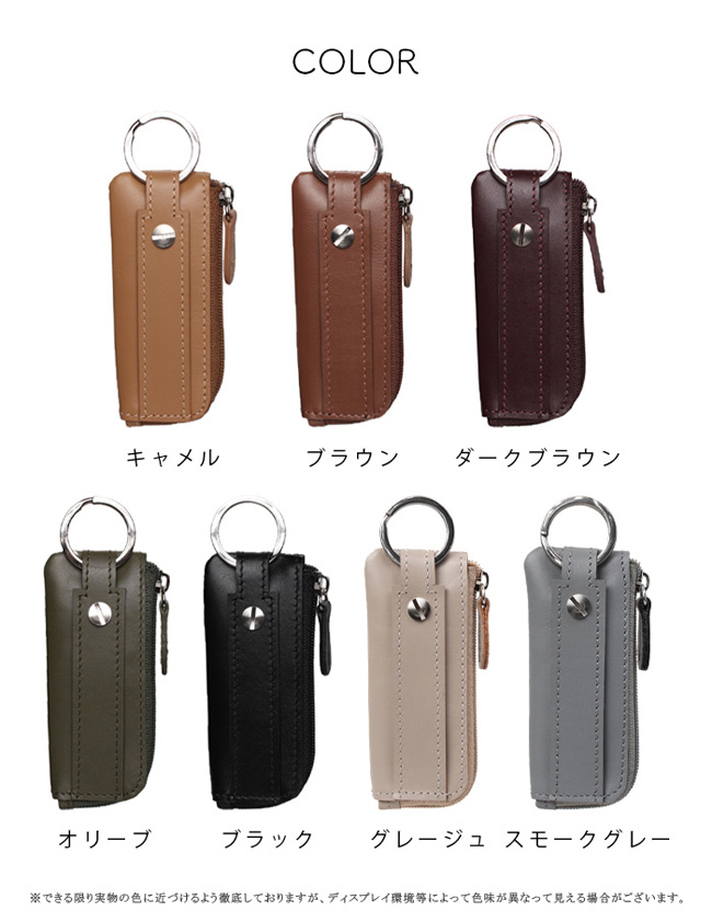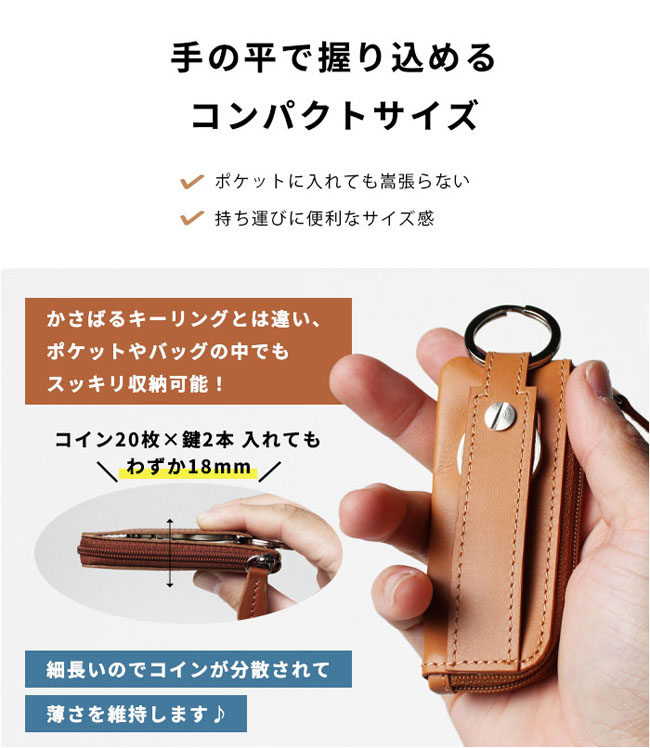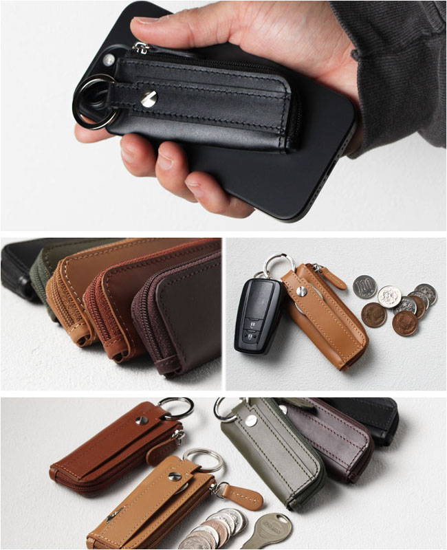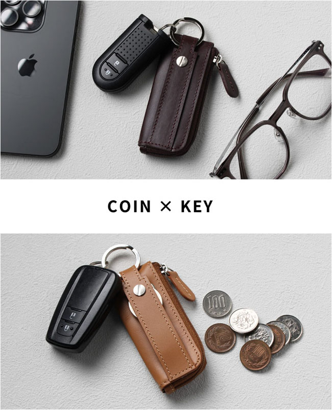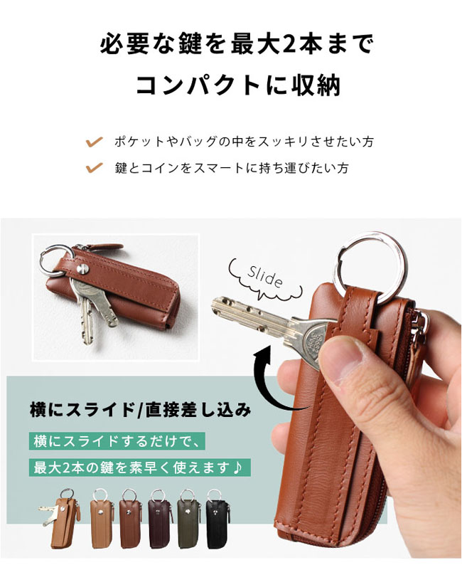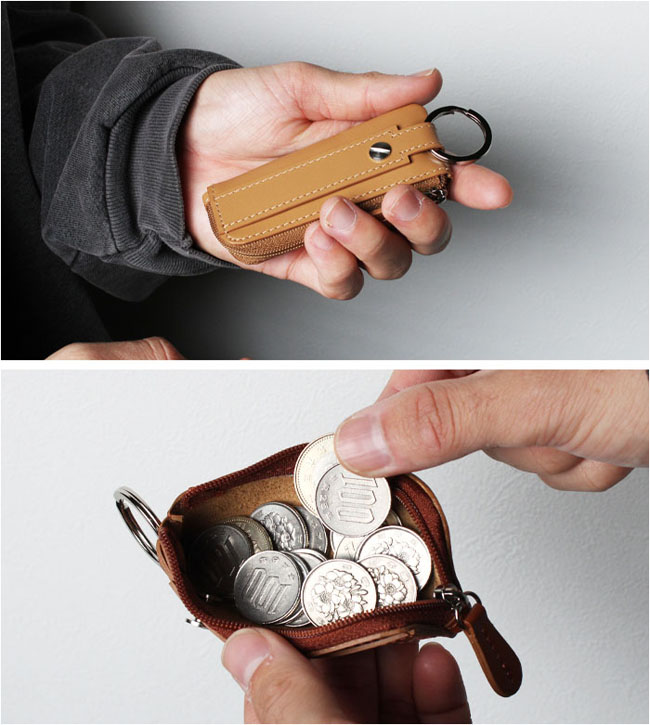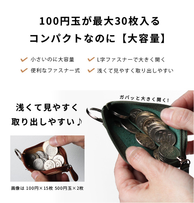 最大2本の鍵と30枚程度の小銭を収納できる、本革コンパクトコインケース。 コンパクトなのに最大30枚の100円玉が入る大容量!L字ファスナーでガバッと開き、浅くて見やすく取り出しやすい設計。 最大2本の鍵を装着でき、横にスライドしてそのまま鍵穴に差し込み可能です。