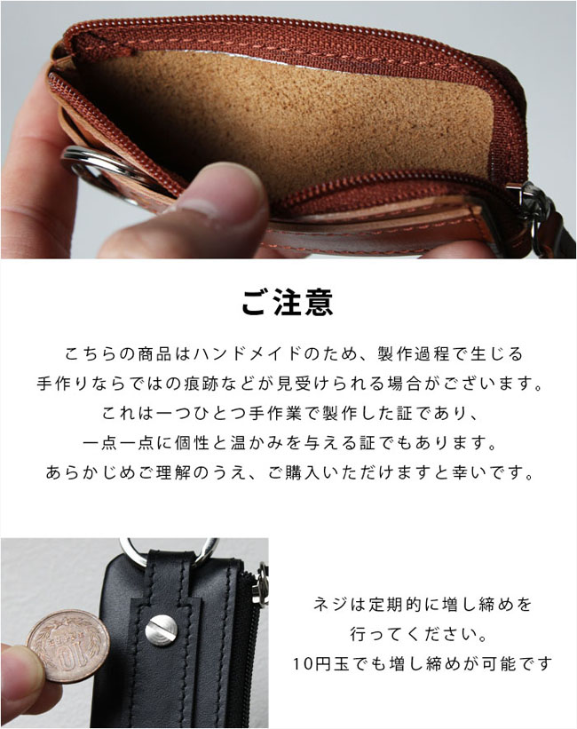 最大2本の鍵と30枚程度の小銭を収納できる、本革コンパクトコインケース。 コンパクトなのに最大30枚の100円玉が入る大容量!L字ファスナーでガバッと開き、浅くて見やすく取り出しやすい設計。 最大2本の鍵を装着でき、横にスライドしてそのまま鍵穴に差し込み可能♪ ふらっとコンビニへ買い物する際、ミニ財布のサブウォレットとしてや、駐車場の支払い、アウトドアなどのアクティブなシーンにもおすすめです。 上部には、スマートキーやリールストラップを取り付けたりするのに便利な二重リング付き。 シックなカラー展開と高級感のある素材で、男女問わず使いやすいデザイン。 ポケットやバッグの中でもかさばらず、スタイリッシュに持ち運べます。 これ1つで鍵と小銭をまとめてスッキリ収納!ちょっとしたお出かけがもっと快適になります♪ 本革を使用しているので、耐久性に優れ、末長くお使いいただけます。 こちらの革は比較的エイジングのない革ですが、使い続けることで革が馴染み柔らかい風合いへ変化します。 製作工程での痕跡が見られることもありますが、それは手作業で作られた証であり、大量生産にはない温かみと、ハンドメイドならではの味わいとしてお楽しみください。 革製品は時を重ねるごとに飽きを感じさせない自分だけの美しい表情へと仕上がります。 時を刻む中でレザーの魅力を存分に楽しみながら、末長くお使いいただけましたら幸いです。 ご自身へのご褒美、大切な人へのプレゼントにいかがでしょうか。 |