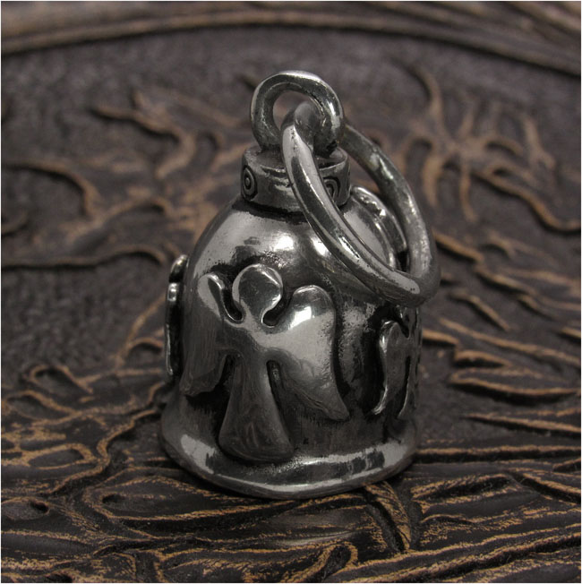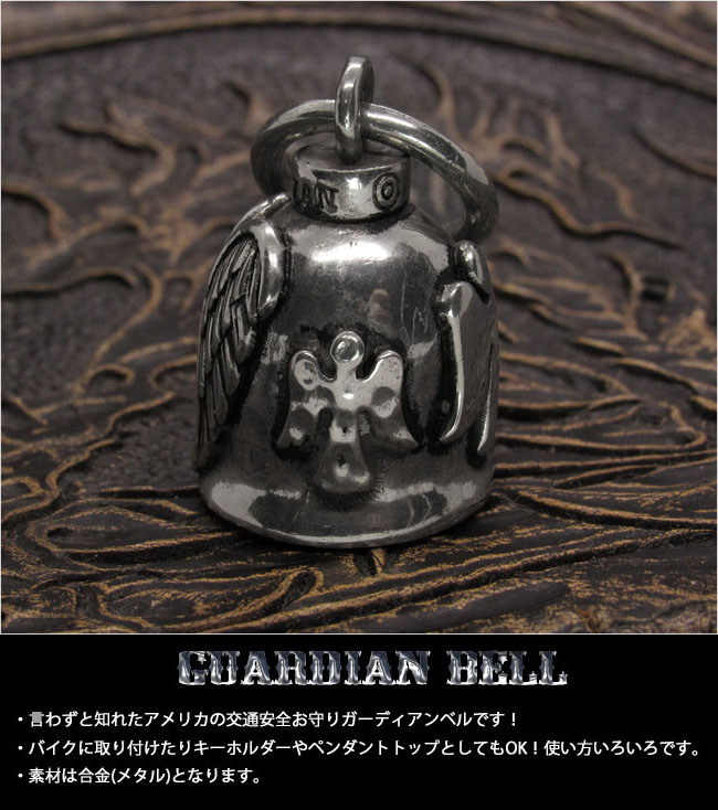 アメリカの交通安全のお守りガーディアンベルです。バイクに取り付けたりキーホルダーやペンダントトップとしてもOK!使い方いろいろです。素材は合金で、ベルはチリンチリンと美しい音色が響きます。