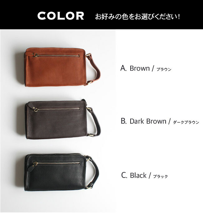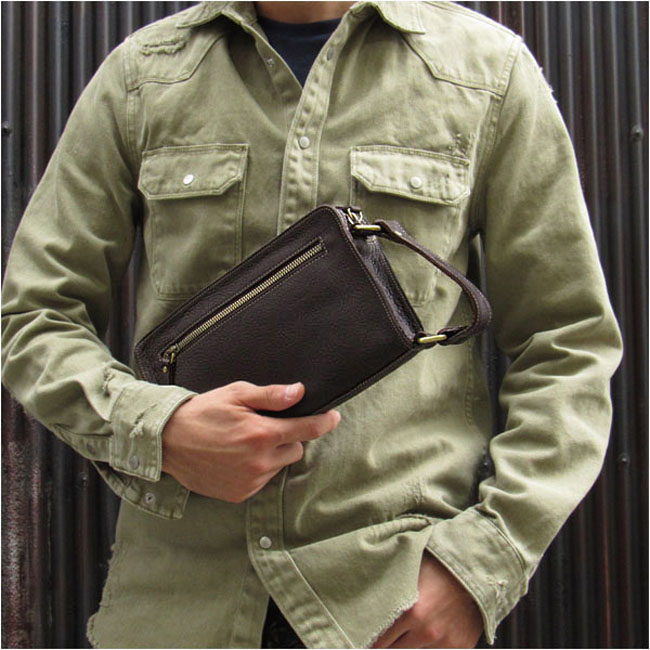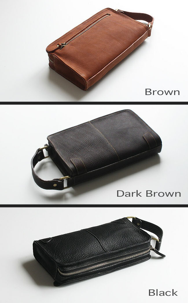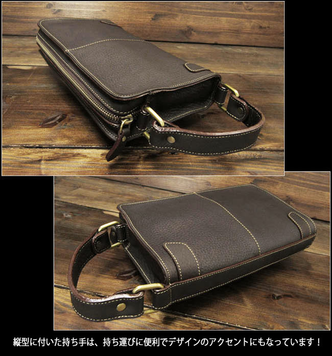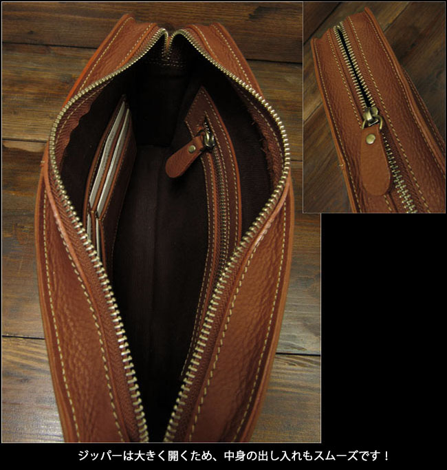 本革にこだわったセカンドバッグ/ハンドバッグです。飽きのこないシンプルなデザインで、シーンを選ばず長くご愛用いただけます。 良質の柔らかいレザーを使用しました。オイルドなめしで革に独特な光沢感があり、シットリした肌触りです。縦型に付いた持ち手は、持ち運びに便利でデザインのアクセントにもなっています。 外側にはスマートフォンなどの収納に便利なポケット付きで、サッと取り出したいアイテムの収納に最適です。見た目以上にマチがしっかりあり、収納力も抜群。ジッパーは大きく開くため、中身の出し入れもスムーズです。 内側にはカードポケット(4箇所)、ジッパー付きポケット、その他収納ポケットを装備。メインルームには、500mlのペットボトルも収納可能。日常使いからちょっとした外出まで、幅広く活躍してくれる一品です。 |