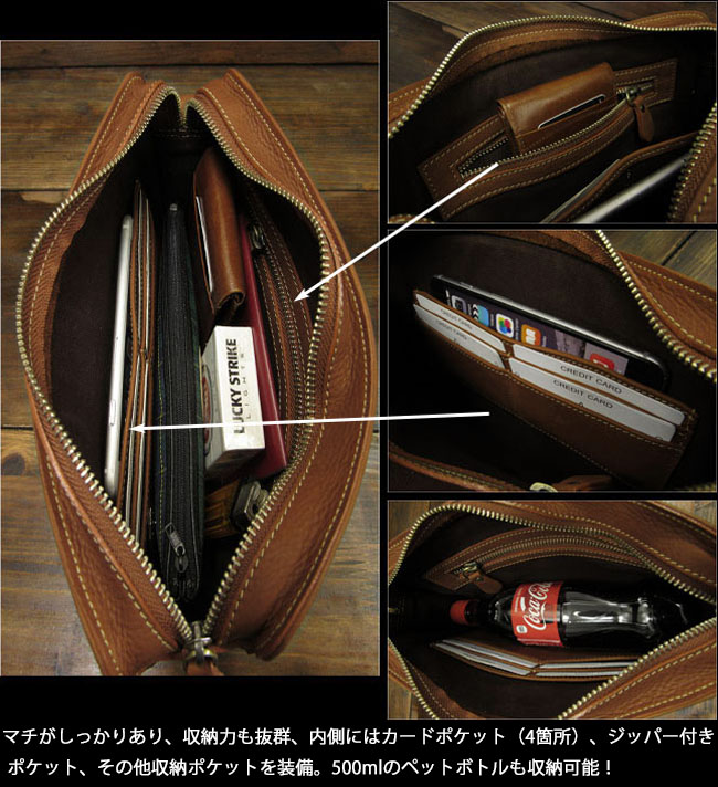 本革にこだわったセカンドバッグ/ハンドバッグです。オイルドなめしで革に独特な光沢感があり、シットリした肌触りです。縦型に付いた持ち手は、持ち運びに便利でデザインのアクセントにもなっています。 外側にはスマートフォンなどの収納に便利なポケット付きで、サッと取り出したいアイテムの収納に最適です。見た目以上にマチがしっかりあり、収納力も抜群。ジッパーは大きく開くため、中身の出し入れもスムーズです。 内側にはカードポケット(4箇所)、ジッパー付きポケット、その他収納ポケットを装備。メインルームには、500mlのペットボトルも収納可能。日常使いからちょっとした外出まで、幅広く活躍してくれる一品です。