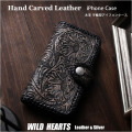 本革にこだわった手帳型ケースiPhoneケースです。良質のサドルレザーを使用し、手彫カービングの上からアンティーク加工を施しています。留め具はスナップホック式でキャップ部分は他のモチーフに取替え可能です。カバー部分(左)にはカードスロットが付いていますのでクレジットカードをはじめICカードや電子マネーなどを入れることができ便利です。 iPhoneの通話スピーカー部分に穴を開けていますので、カバーを閉じた状態で通話ができます。リングが付いていますのでウォレットチェーンやハンドストラップなどを付けることができます。リング部分は¥1,800追加料金でシルバー925製ジョイントパーツ/ドロップハンドルに取り替え可能です。