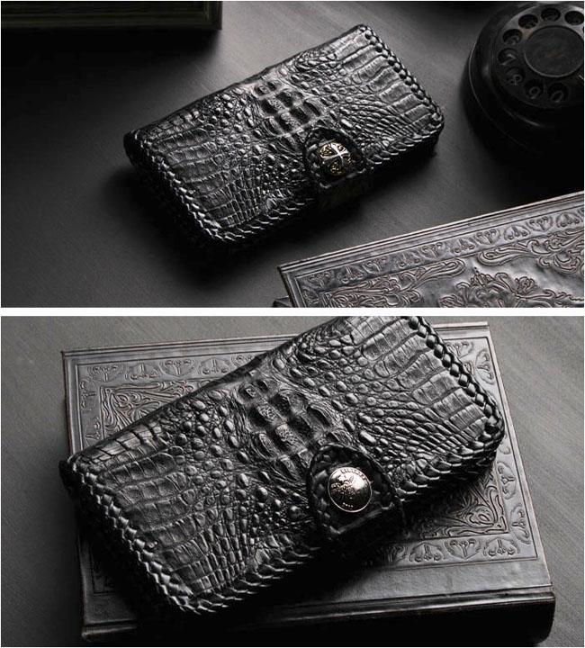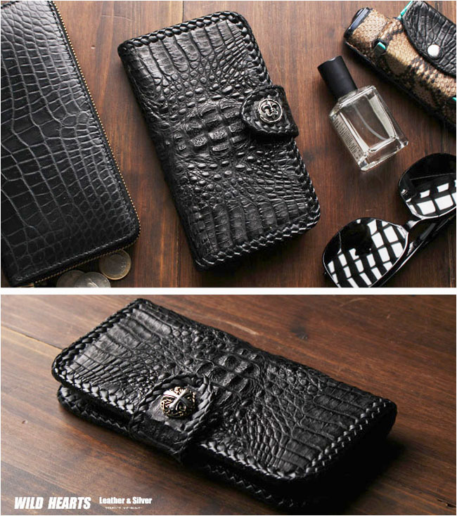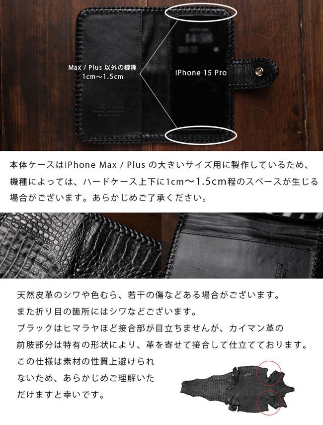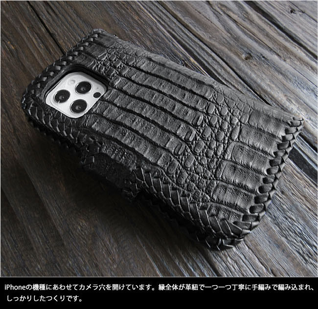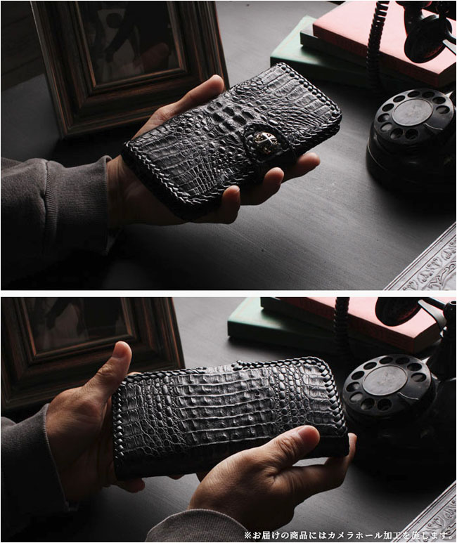 | 製品名 | Phoneケース スマホケース 手帳型 レザーケース カイマン ワニ革 アリゲーター クロコダイル 牛革 ブラック 黒 コンチョ付き |