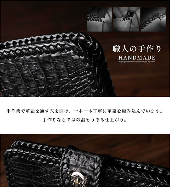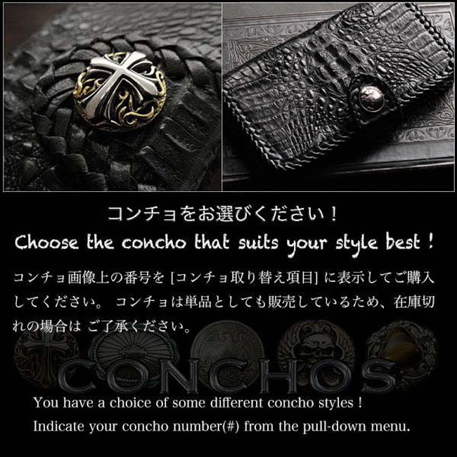 ワニ革:カイマン(タイ政府公認のカイマン/アリゲーターを使用しています。) 牛革(内張) [コンチョ] 1番は合金:ジャーマンシルバー&真鍮:クロス部分 2番は真鍮&シルバー925:クロス部分 3,4,5番は合金:ジャーマンシルバー |