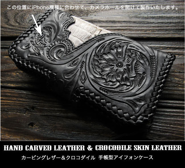 | 製品名 | クロコダイル カービング 手帳型 iPhoneケース 本革 ワニ革 カイマン ブラック&ヒマラヤ |
