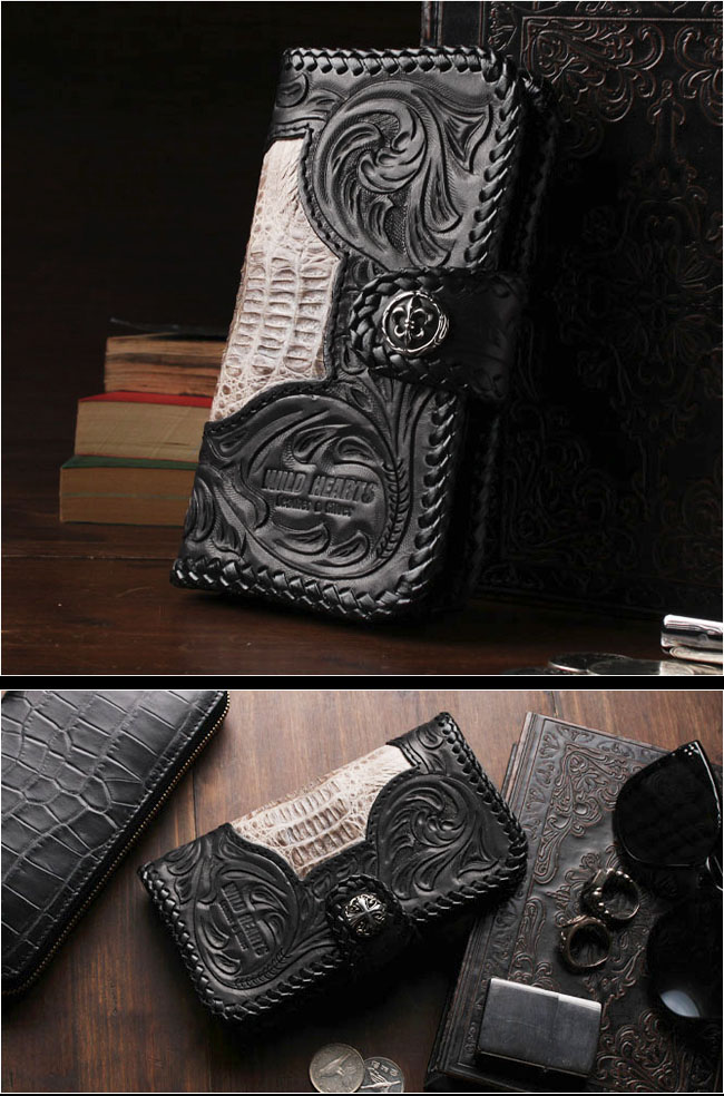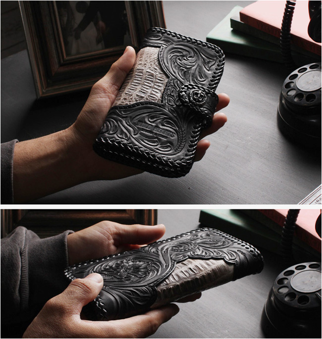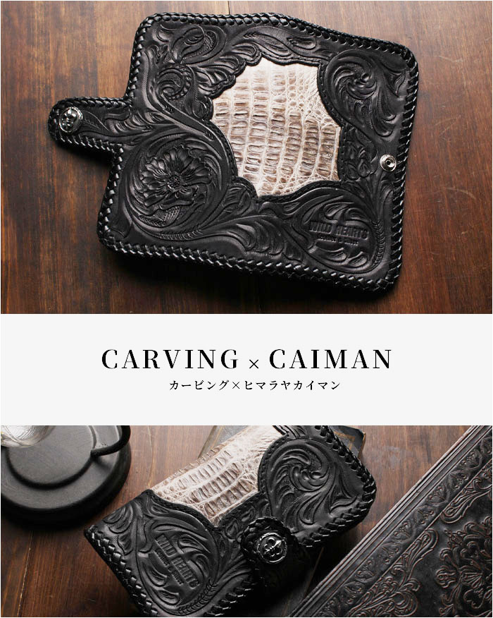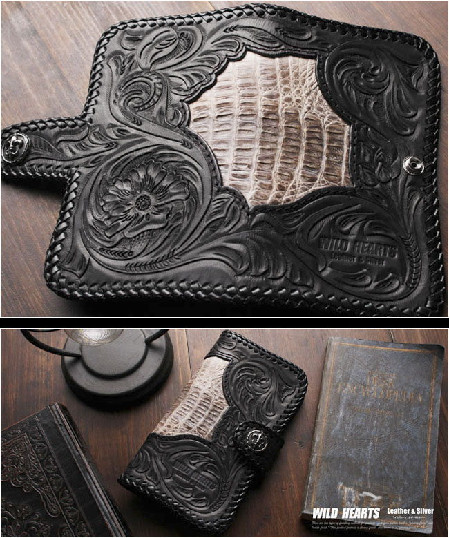 革職人により1つ1つ手彫であしらわれたゴシックテイストのカービングにヴィンテージ加工があしらわれています。 中央のくり抜き部分はクロコダイル(カイマン)となっております。 ワニ革とカービングレザーの組み合わせが最高です。