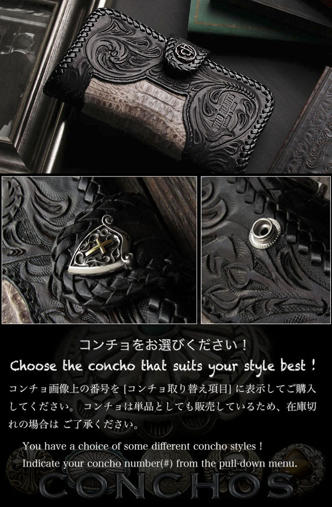 ワニ革:カイマン (タイ政府公認のカイマン/アリゲーターを使用しています。) 牛革(内張) [コンチョ] 1番は合金:ジャーマンシルバー&真鍮:クロス部分 2番は真鍮&シルバー925:クロス部分 3,4,5番は合金:ジャーマンシルバー |