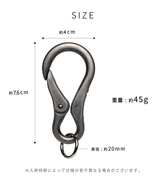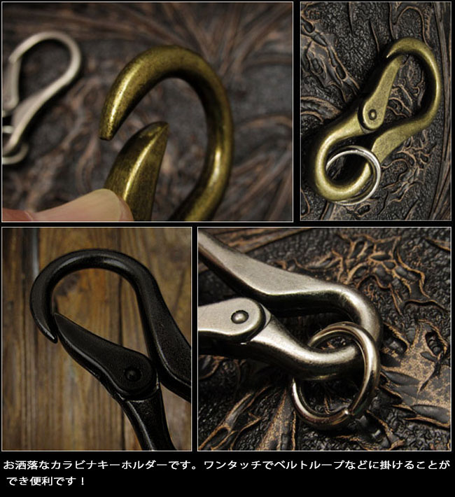 お洒落なカラビナキーホルダーです。ワンタッチでベルトループに掛けることが出来て便利です。シルバー、ゴールド、ブラックの中からお選びください。 素材はシルバーカラーとブラックカラーが合金、ゴールドカラーが真鍮メッキとなります。 ※新品ですが、製作工程時の若干の細かい傷などがある場合がございます。 |