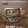 職人により1つ1つ手彫でカービングが施されています。型押し(既製品)にはないハンドメイド/手作りならではの風合いが特徴のレザーベルトです。立体感ある花柄模様のカービングが最高の仕上がりです! 両面貼りレザーの贅沢な作りです。厚みがあり、丈夫なベルトをお探しの方にオススメです。 デニムなどのカジュアルなスタイルに相性抜群です。ユニセックスで男女どちらでもご愛用いただけます。