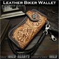 Genuine Cowhide Leather Biker Wallet Floral Carved by Hand Tan&Dark Brown WILD HEARTS Leather&Silver (ID lw0817) |