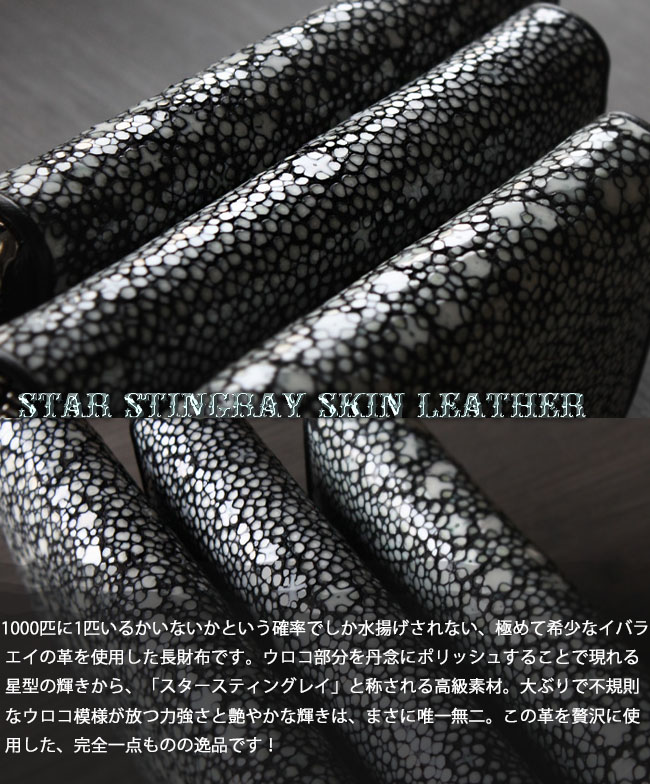 1000匹に1匹いるかいないかという確率でしか水揚げされないエイ革(イバラエイ)を使用した長財布となります。 ウロコ部分をポリッシュすると星型模様が出現することから「スタースティングレイ」と呼ばれている希少な高級レザーです。そのスタースティングレイを使用した完全一点もの商品となります。大きめのウロコが不規則でワイルド感抜群です! 財布のインナー部分はジャバラ状になって大きく開き、中身が見やすいです。12箇所のカード入れ、お札入れ/その他収納が6箇所とコインケースが付き大容量で便利です。
