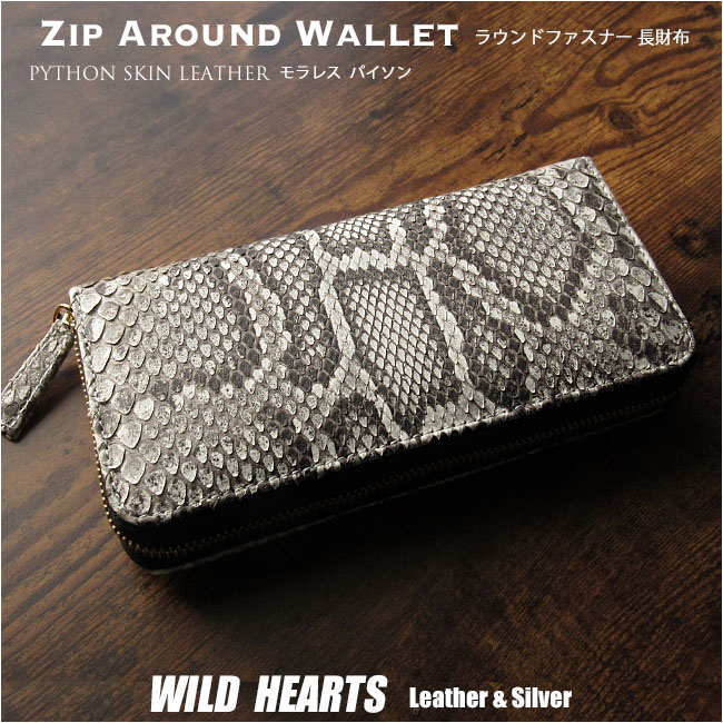 蛇柄独特の美しいウロコ模様が特徴のパイソン(モラレス)を使用したラウンドファスナー長財布です。 継ぎ目なしの一枚革を使用しています。自然な風合いそのままのマット仕上げとなります。 ジャバラ状になって大きく開き中身も見やすく出し入れしやすいのがラウンドファスナーの特徴です。内装も充実しており、お札や小銭・カード類などまとめて収納でき便利です。ファスナーの色はシルバーかゴールドからお選びください。