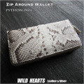 バックカット(背割り)されたモラレスパイソン使用、ワイルドなテイストが特徴です。継ぎ目なしの一枚革を使用しています。 自然な風合いそのままのマット仕上げとなります。 ジャバラ状になって大きく開き、中身も見やすく出し入れしやすいラウンドファスナー長財布です。 ファスナーはシルバーとゴールドのどちらかお好みの色をお選び下さい。