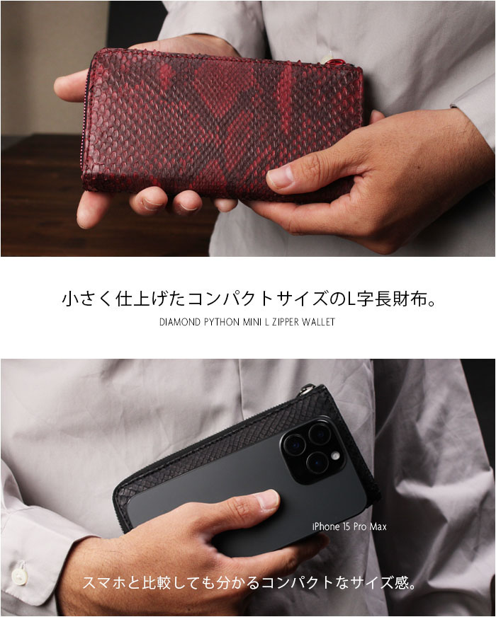 金運を呼ぶといわれる蛇革を使用し、スマートに持ち運べるコンパクトサイズに仕上げたL字ファスナー長財布。革の表面はマットでやさしい肌触り。ダイヤモンドパイソン特有の美しい石垣模様が際立つ、唯一無二の蛇革財布です。 決して大容量ではありませんが、必要最低限の紙幣・小銭・カードを長財布として携帯できる、ミニマル志向のコンパクトウォレットです。
