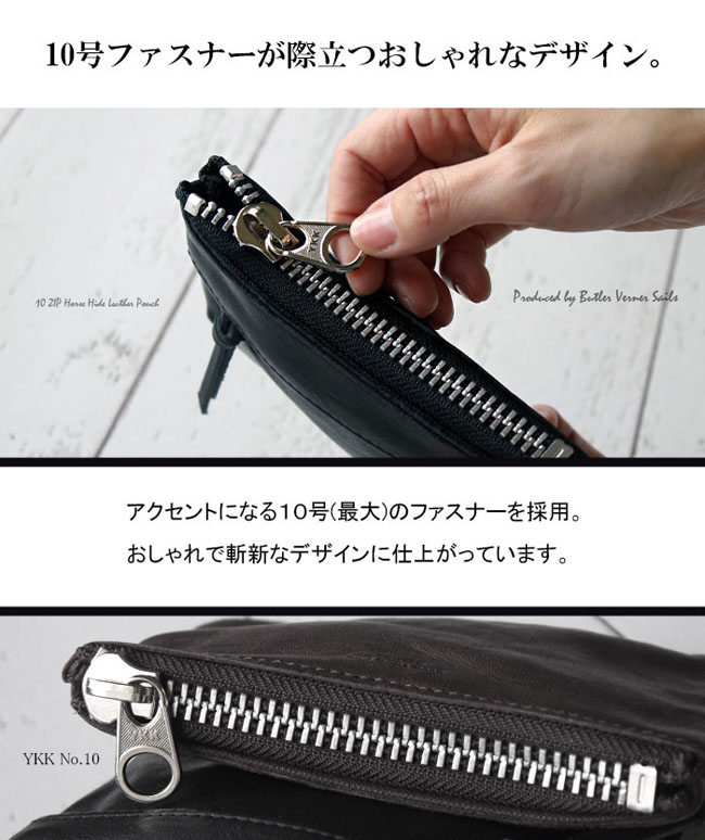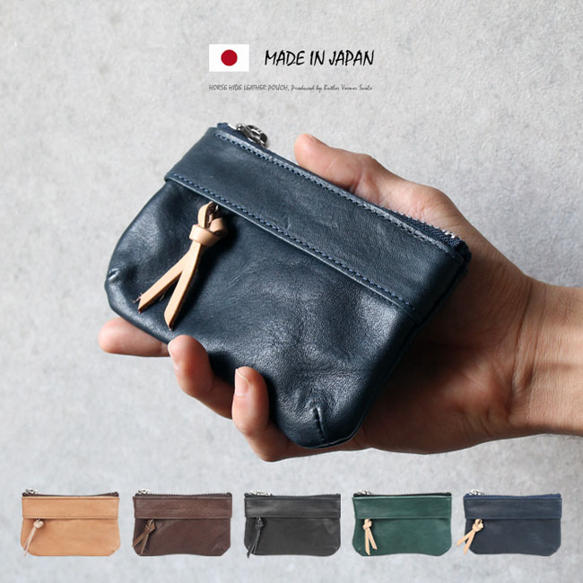 毎日の暮らしで気軽に使えるマルチポーチです。素上げタイプの馬革がいい味をかもし出しています。 大きめのファスナーを採用しており、ワイルドさとおしゃれ感をプラス。前面には小さなポケットも付いているので、小物を分けて収納できます。 ちょっとした必需品をまとめて入れるのにちょうどいいサイズ感。ひとつ持っていると、日常のあらゆるシーンで重宝します。