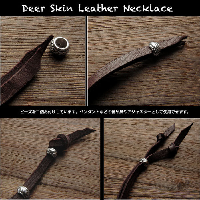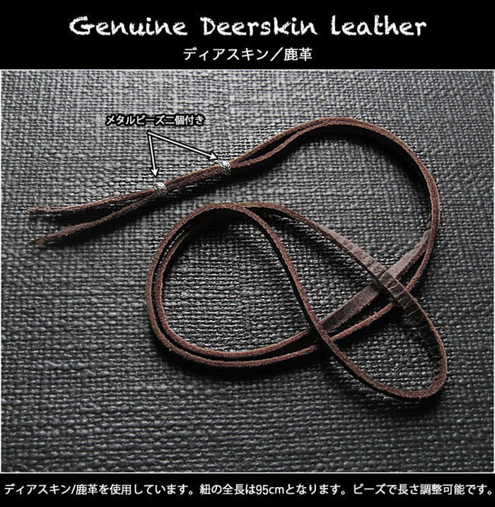 ディアスキン(鹿紐本革)ネックレス紐単体での販売です。 非常に柔らかく肌当たりが良いため、ネックレスやストラップに最適な革素材です。牛革にはないしなやかさと柔軟性があり、首元に自然に馴染みます。 また、見た目の繊細さとは裏腹に耐久性にも優れており、長くご愛用いただけます。付属のビーズ2個は、ペンダントの留め具や長さ調整用のアジャスターとしても使用可能です。 シンプルだからこそ、使い方は自由。自分だけのアレンジを楽しめる本革ネックレス紐です。