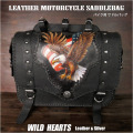 手彫りされたアメリカンイーグルのモチーフがクールなサドルバッグです。バッグの表面は本革(牛革)を使用しています。 カバー中央部分は厚めのサドルレザー、そこにカービングを施し、その上からペインティングしています。サイドポケットが両サイドについていますので、バイクの左右どちら側でもお使い頂けます。