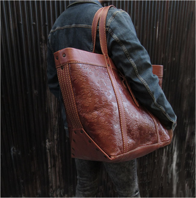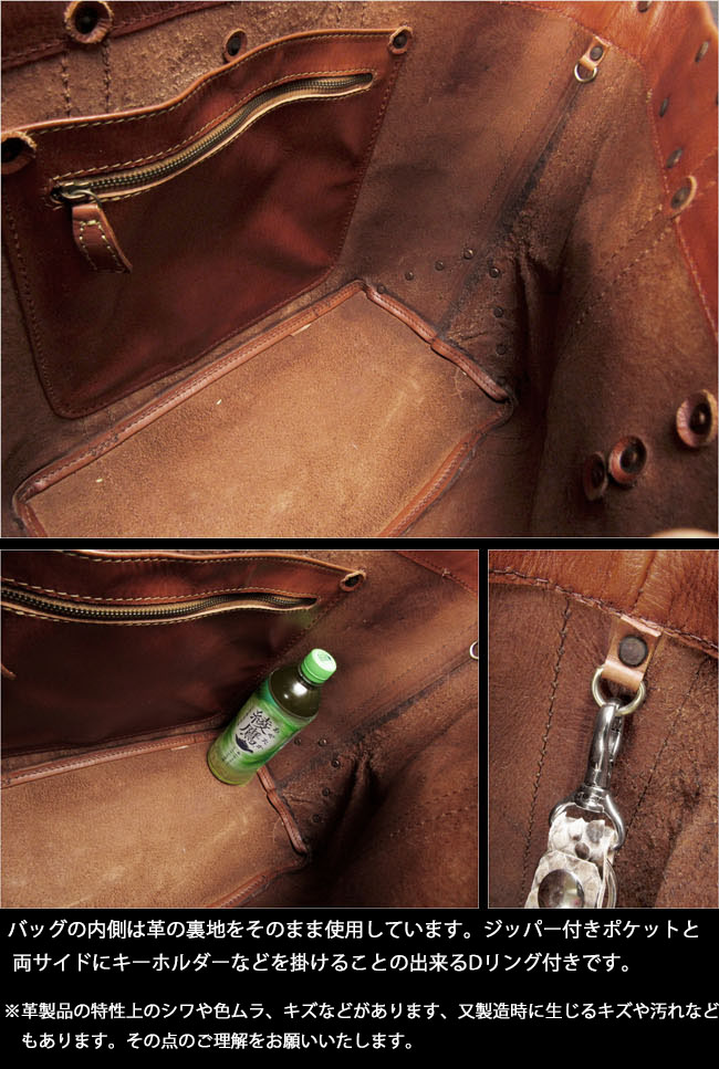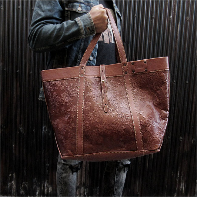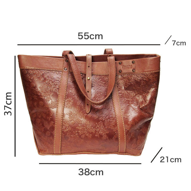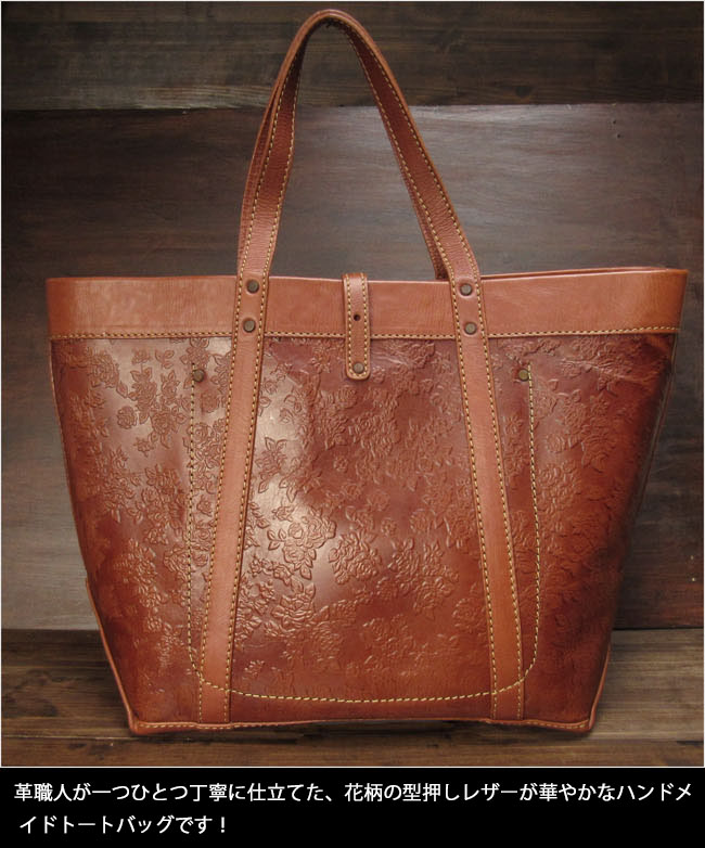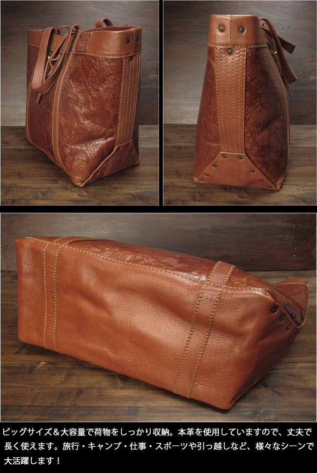花柄の型押しを施した革がお洒落な、革職人によるハンドメイドバッグです。とにかく大きくて頼れる本革トートバッグです。 ビッグサイズ&大容量で荷物をしっかり収納。本革を使用していますので、丈夫で長く使えます。 旅行・キャンプ・仕事やスポーツなど、様々なシーンで大活躍します。 バッグの内側は革の裏地をそのまま使用しています。ジッパー付きポケットと両サイドにキーホルダーなどを掛けることの出来るDリング付きです。 大きめバッグをお探しの方に、ぜひおすすめしたい一品です。※この商品はプレゼント用のラッピングは出来ません。 |