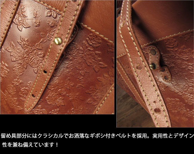 花柄の型押しを施した革がお洒落な、革職人によるハンドメイドバッグです。 ビッグサイズ&大容量で荷物をしっかり収納。本革を使用していますので、丈夫で長く使えます。旅行・キャンプ・仕事やスポーツなど、様々なシーンで大活躍。 バッグの内側は革の裏地をそのまま使用しています。ジッパー付きポケットと両サイドにキーホルダーなどを掛けることの出来るDリング付きです。 大きめバッグをお探しの方に、ぜひおすすめしたい一品です。