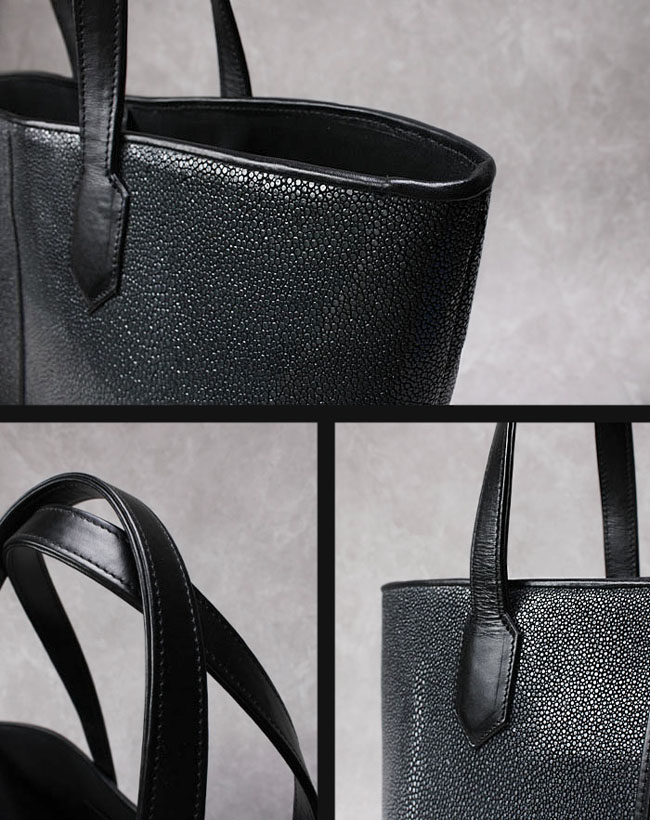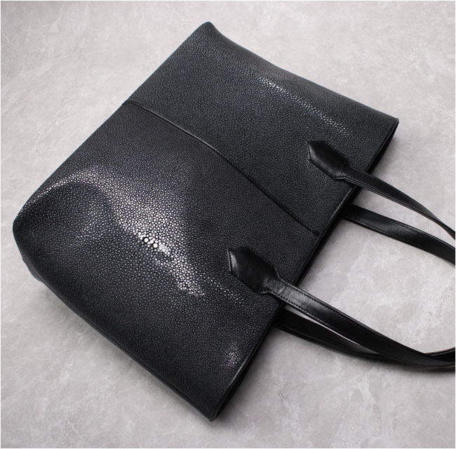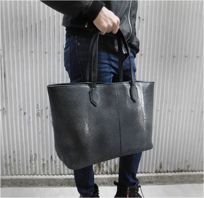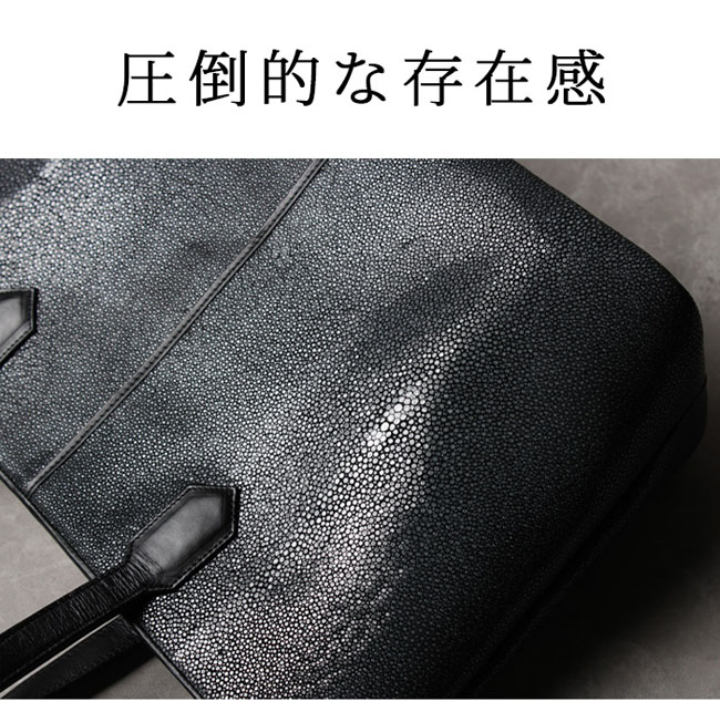 スティングレイ/エイ革にこだわった手作りトートバッグです。全面に4匹の大型のエイ革が使用され表面には硬質で美しい粒状のウロコが並び、その独特の模様が高級感を際立たせます。 さらに吟スリ(研磨)加工を施すことで、滑らかな光沢と宝石のような輝きを引き出しました。ビッグサイズで、大容量の収納可能です。ユニセックスで男女どちらでもご愛用いただけます。