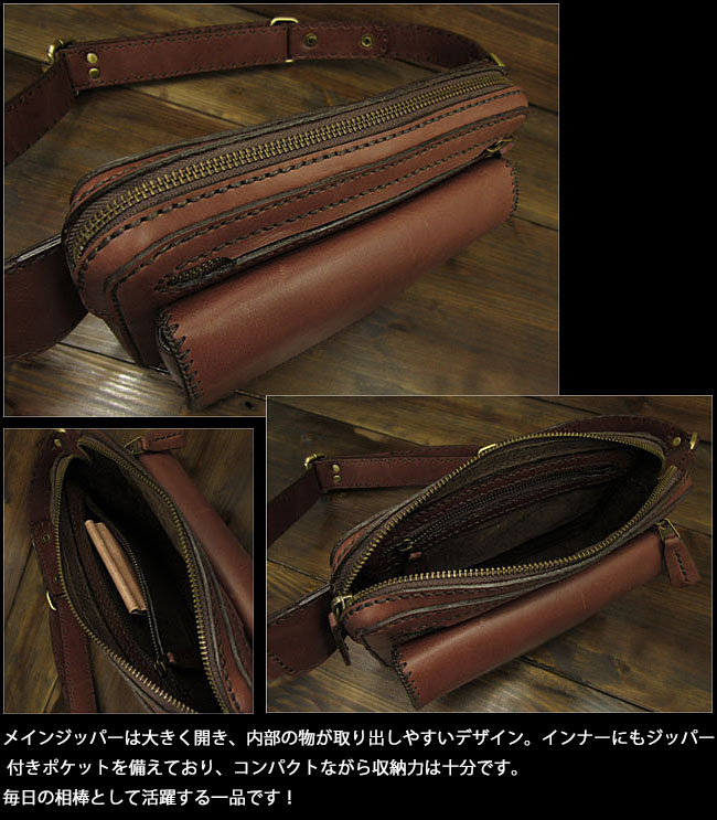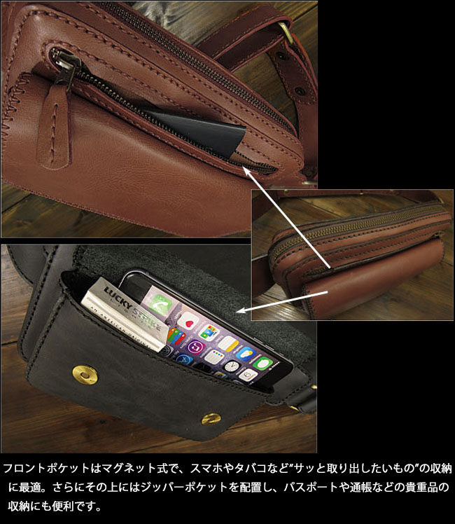 ハンドフリーで便利です。いつも持ち歩く日常品がすっきり収納可能なサイズ感、大き過ぎず、小さ過ぎずでいい感じです。使い勝手抜群のウエストバッグです。 肩掛けボディーバッグとしても使えます。男女問わずに、ユニセックスでご愛用いただけます。 フロントポケットはマグネット式で、スマホやたばこなどサッと取り出したいものを入れるのに最適です。フロントポケットの上にもジッパーポケットがあります。パスポートや通帳などの貴重品入れに最適です。 ジッパーは大きく開き内容物を取り出しやすいです。インナー部分にもジッパー付きポケットがあります。コンパクトですがいつも持ち歩く日常品がすっきり収納可能なサイズ感が最高です。 肩掛け又ウエストバッグと使い方によりショルダーベルト/ウエストベルトの長さは調整可能です。お好みのカラーを3色の中からお選び下さい。 ※革製品ですので、天然素材としてのシワやキズ、色ムラ、又製作工程時の若干の細かいキズや細部の仕様変更がある場合があります。その点のご理解お願いいたします。 |