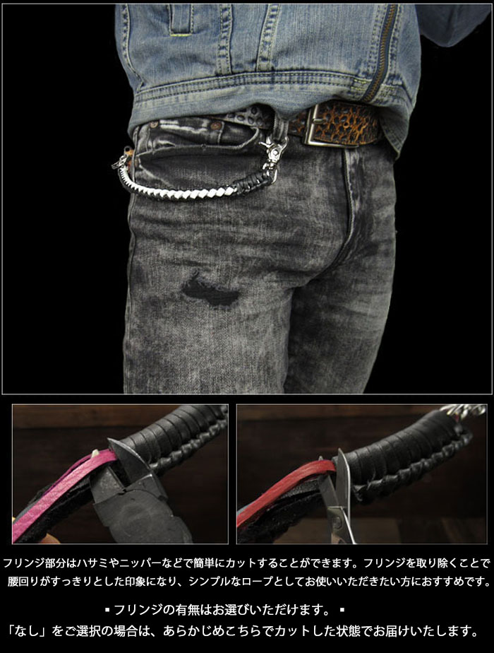 1つ1つ手作業で編み込まれたレザーウォレットチェーンです。合計12色を用意しています。ウォレットやベルトループキーホルダーと合わせたりして腰まわりのオシャレにおすすめです。 フリンジは「あり」または「なし」からお選びいただけます。 「なし」をご選択の場合は、当店にてフリンジをカットしてお届けいたします。 フリンジを取り除くことで腰回りがすっきりとした印象になり、シンプルなロープとしてお使いいただきたい方におすすめです。 |