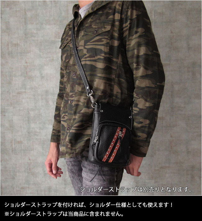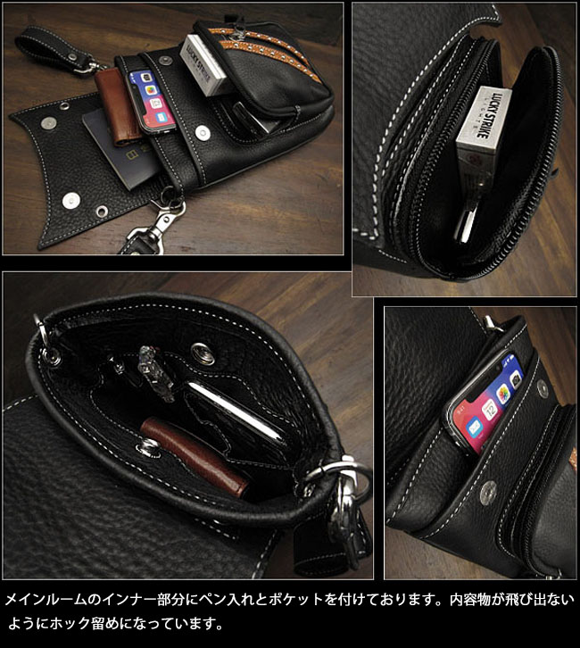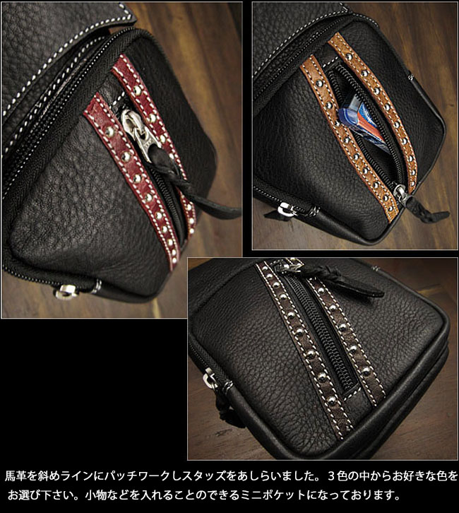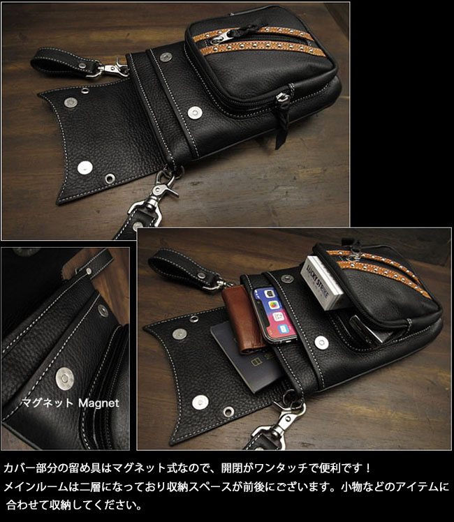 いつも持ち歩く日常品がすっきり収納でき、ベルトループでベルトに装着、またはベルトに直接装着も可能なウエストポーチです。 弊社オリジナルデザインで、本革にこだわり良質の柔らかいレザーを使用しました。オイルドなめしで革に独特な光沢感がございます。 馬革を斜めラインにパッチワークしスタッズをあしらいました。3色の中からお好きな色をお選び下さい。小物などを入れることのできるミニポケットになっております。 ジッパー付きフロントポケットは、サッと取り出したいものを入れるのに便利です。 カバー部分の留め具はマグネット式なので、開閉がワンタッチで便利です。メインルームは二層になっており収納スペースが前後にございます。小物などのアイテムに合わせて収納してください。 付属の革ひもを太ももに通すことでレッグストラップとして固定でき、バイク乗りにもおすすめです! |