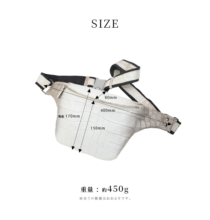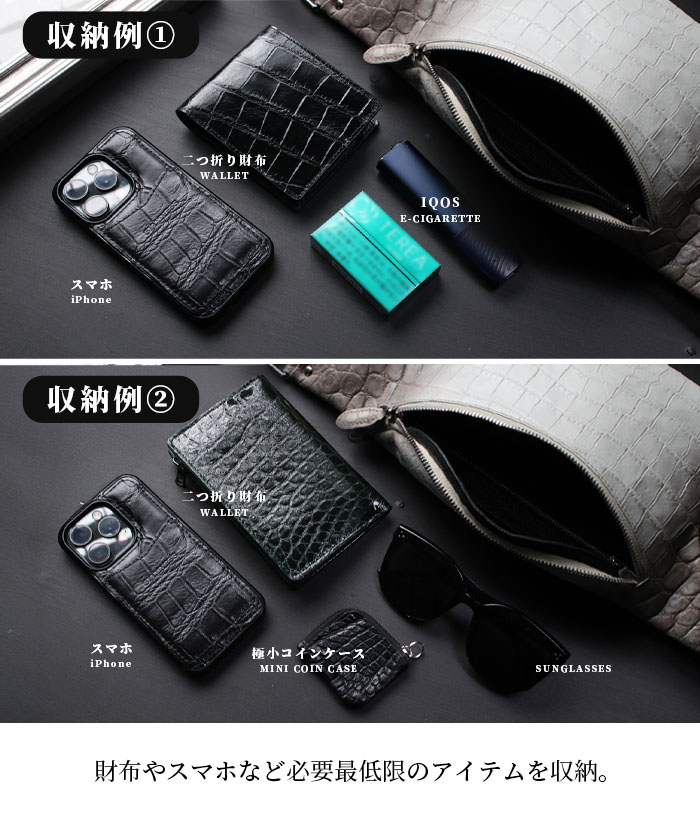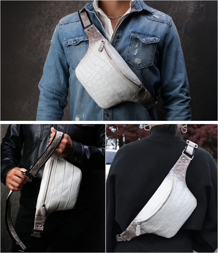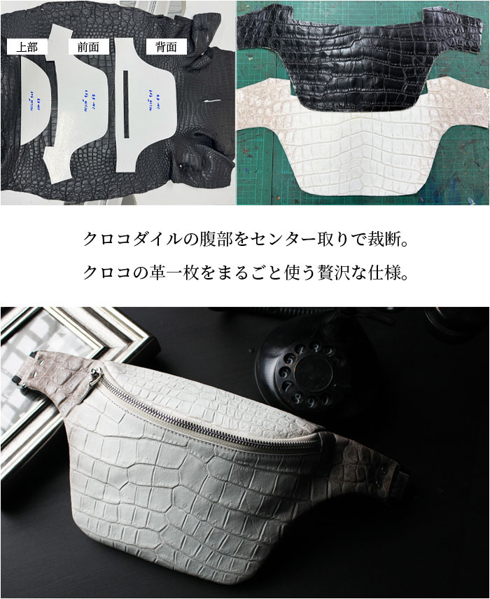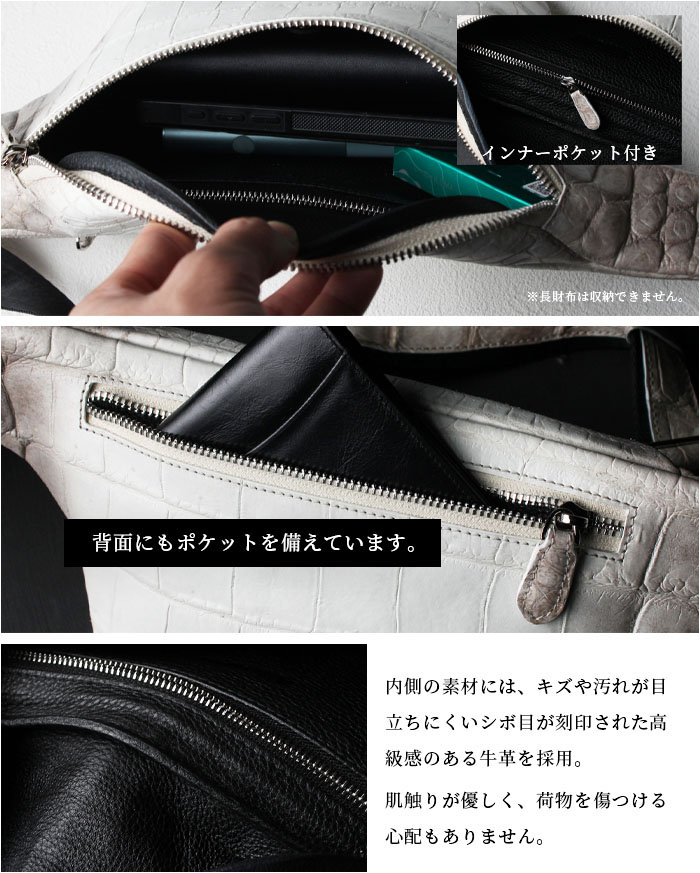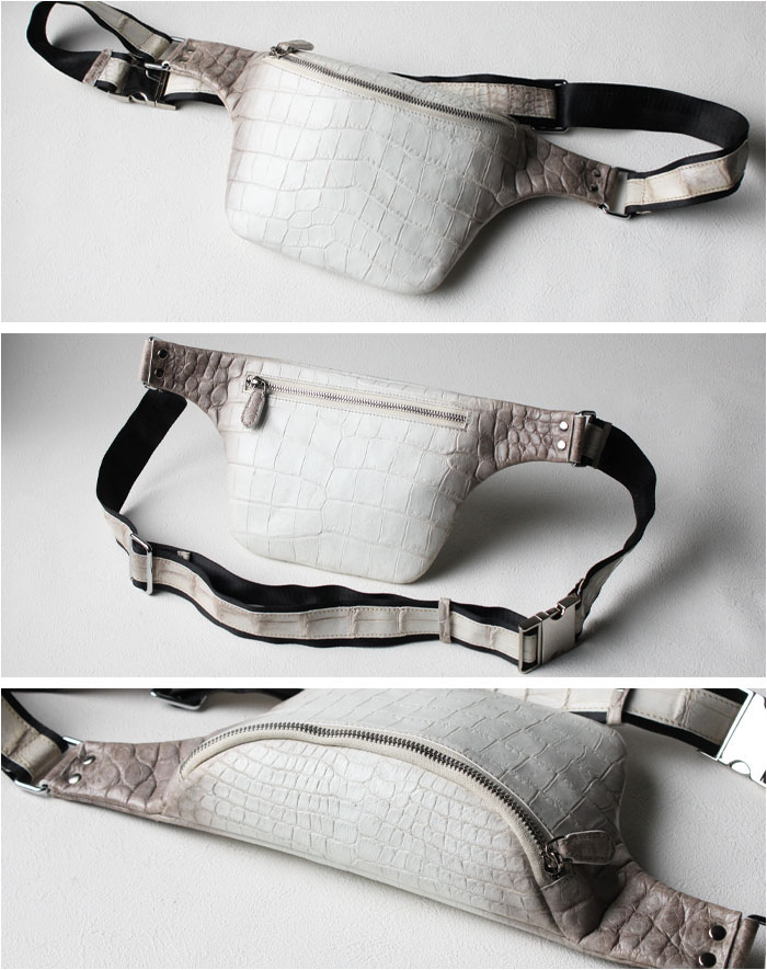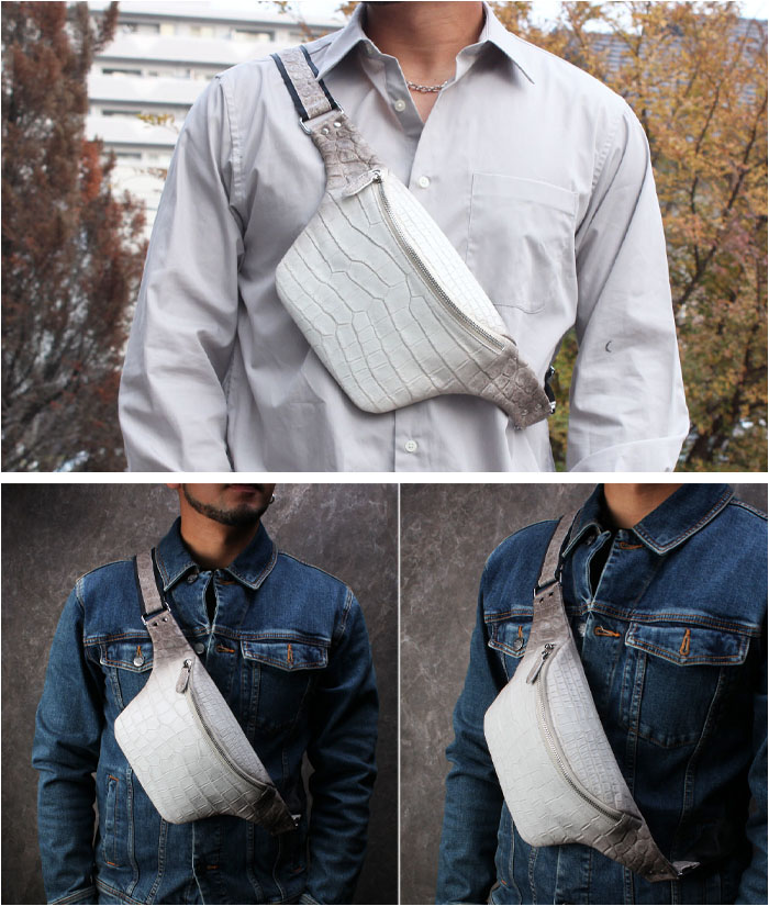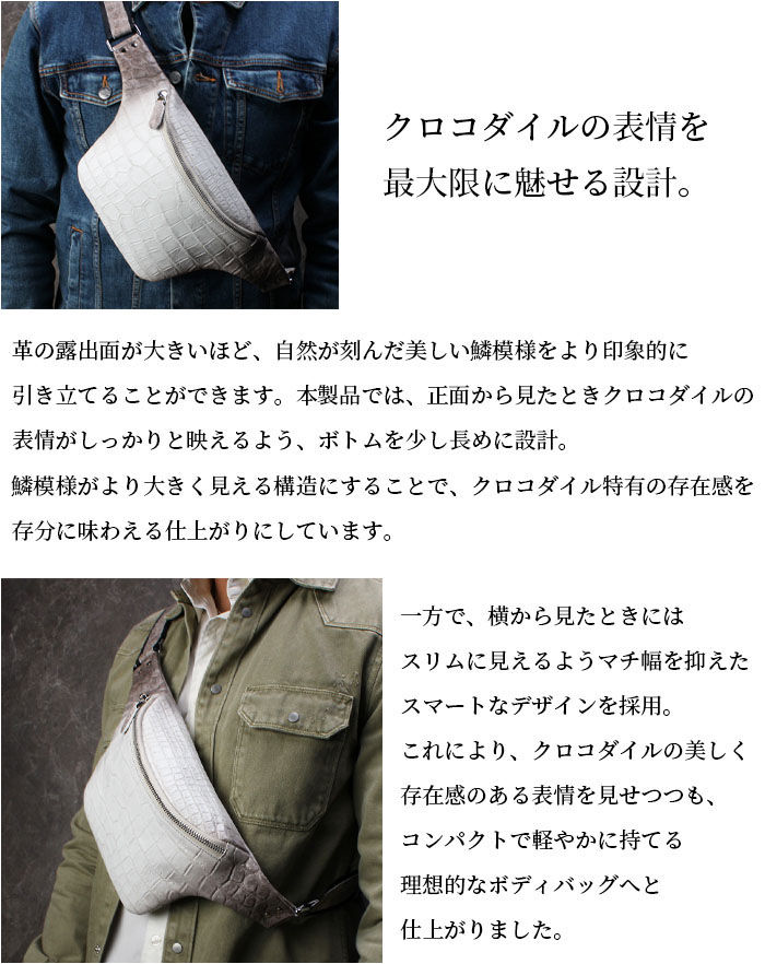 これにより、クロコダイルの力強い存在感を存分に引き立てながらも、コンパクトで軽やかに持てる理想的なボディバッグに仕上げています。