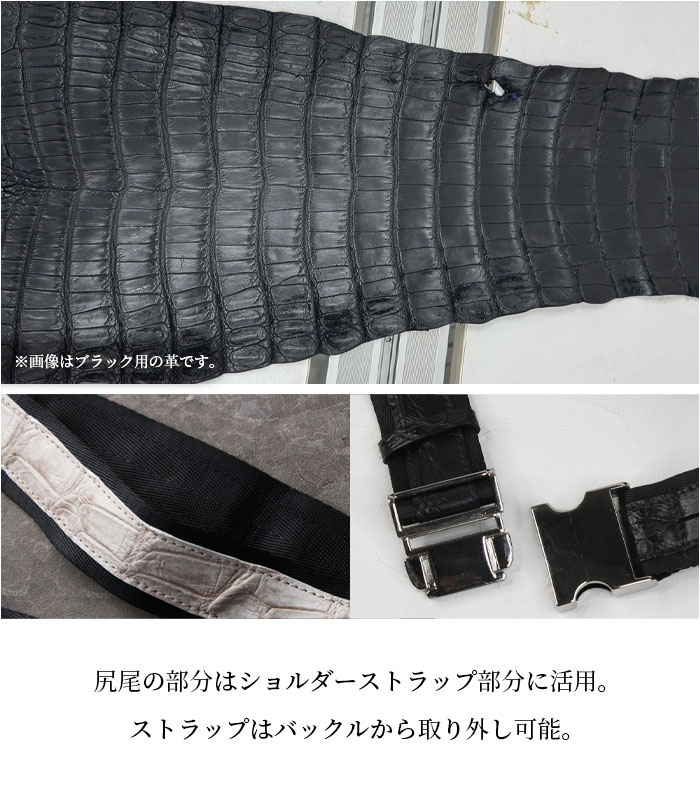 ショルダーベルトはクロコダイルレザーと生地を組み合わせた仕様で、デザイン性と耐久性を両立。ワンタッチバックルにより着脱が簡単で、長さ調整も可能です。
