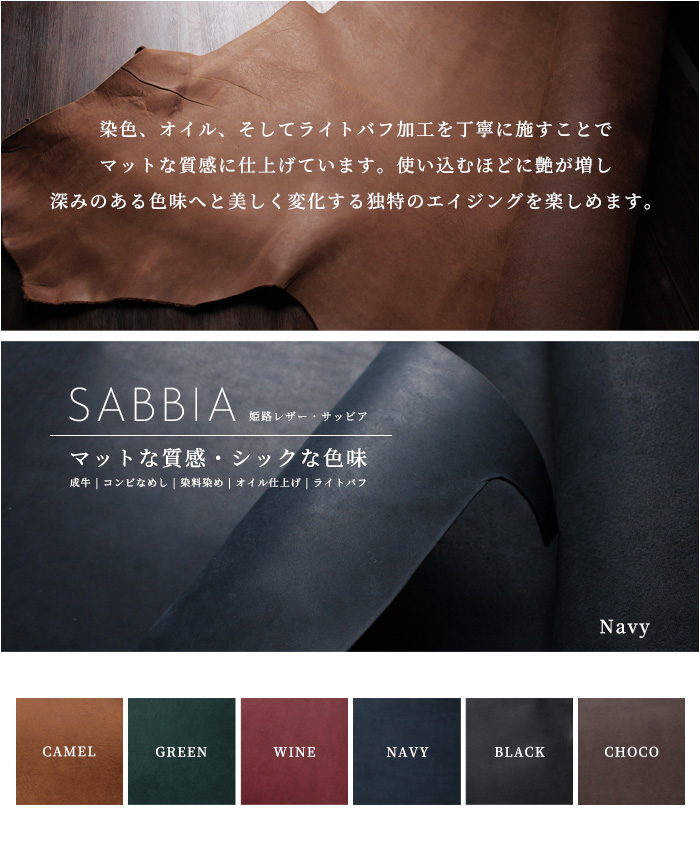 染色・オイル・ライトバフ加工により、しっとりとした手触りとマットで上品な質感、落ち着いた色味に仕上げています。