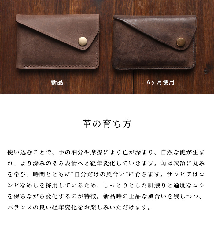 使い込むほどに手の油分や摩擦で色が深まり、自然な艶が生まれ、より味わい深い表情へと変化。角も徐々に丸みを帯び、自分だけの風合いへと育っていきます。
