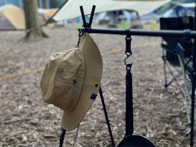 帽子をかぶらない時は、カラビナをネームタグやドローコードに通してバッグやハンギングラックに簡単装着。カラビナはベルトループに付けて、普段使いのアクセントにも。