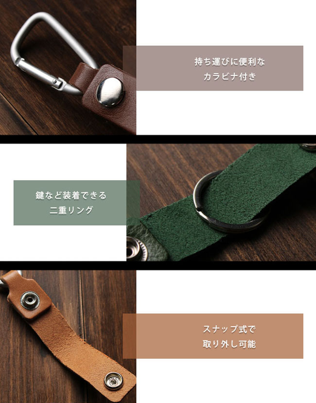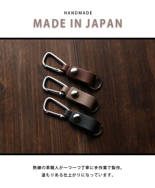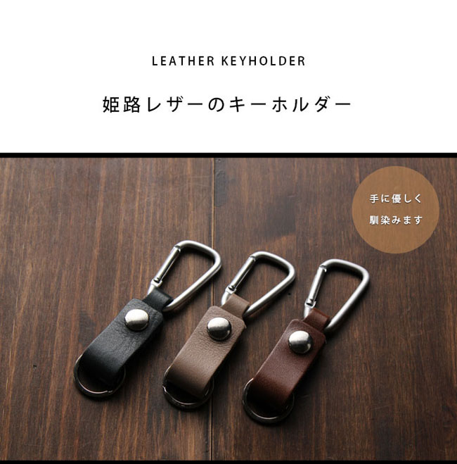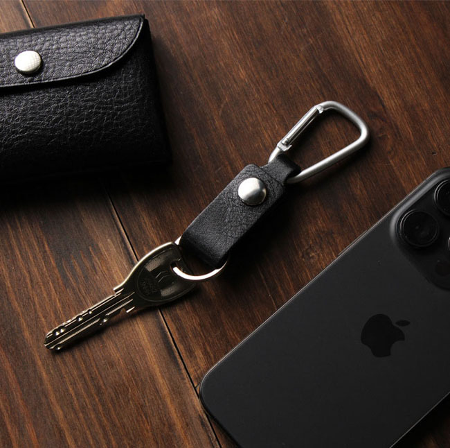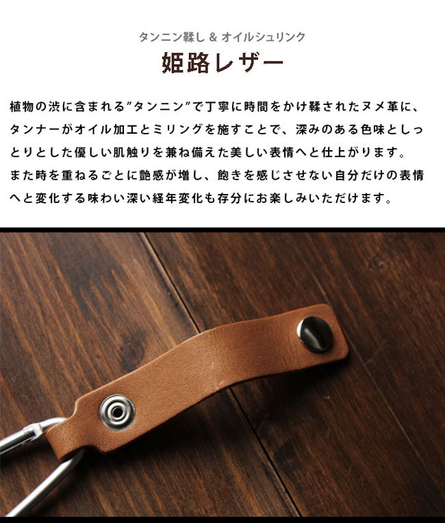 姫路産オイルシュリンクレザーを使用したシンプルなキーホルダー。鍵やスマートキーを装着でき、使うほど手に馴染み味わい深い表情へと変化します。カジュアルにもフォーマルにも馴染み、丈夫で長く愛用できます。