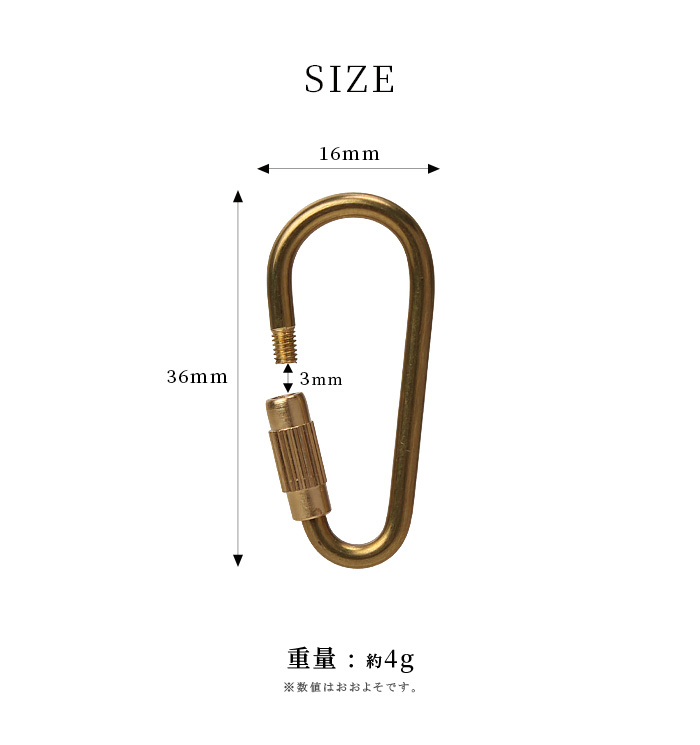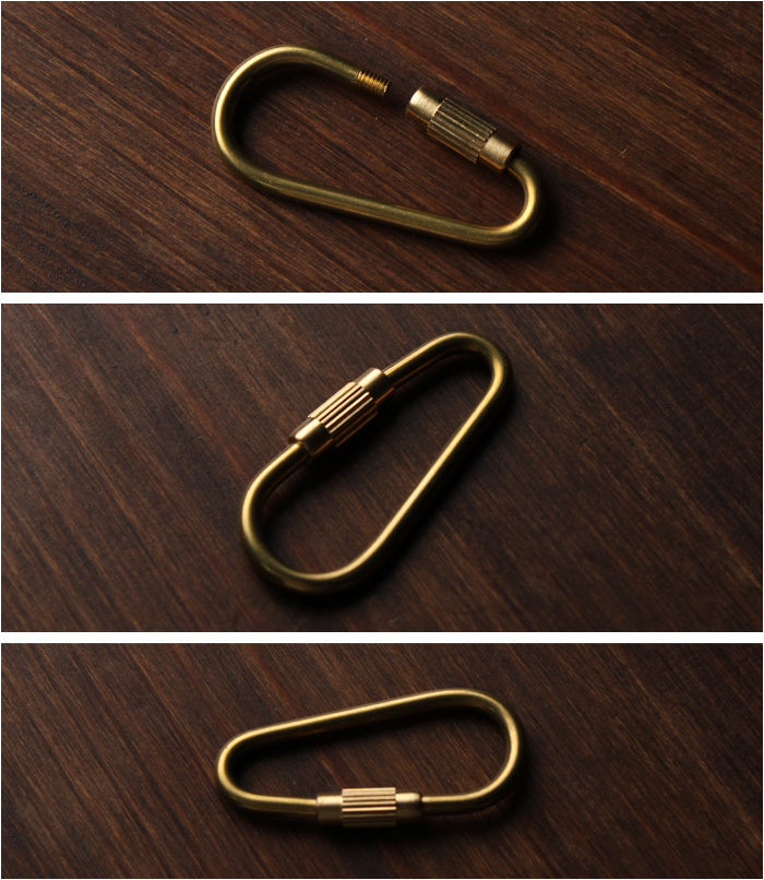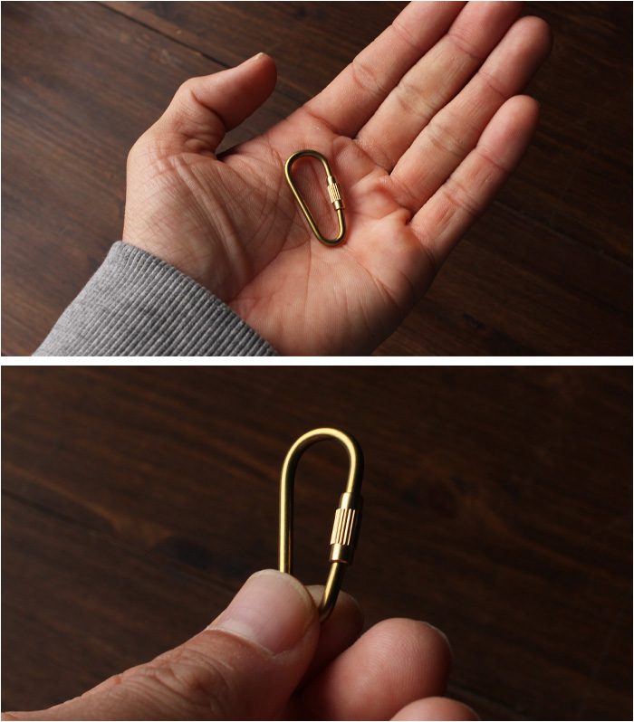 真鍮製のロック式カラビナ。小さくてかわいいサイズ感。レザークラフトやデイリーユースでお使いいただけます。