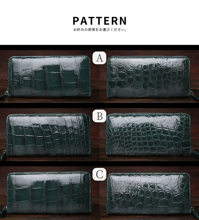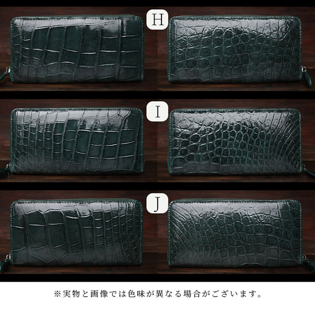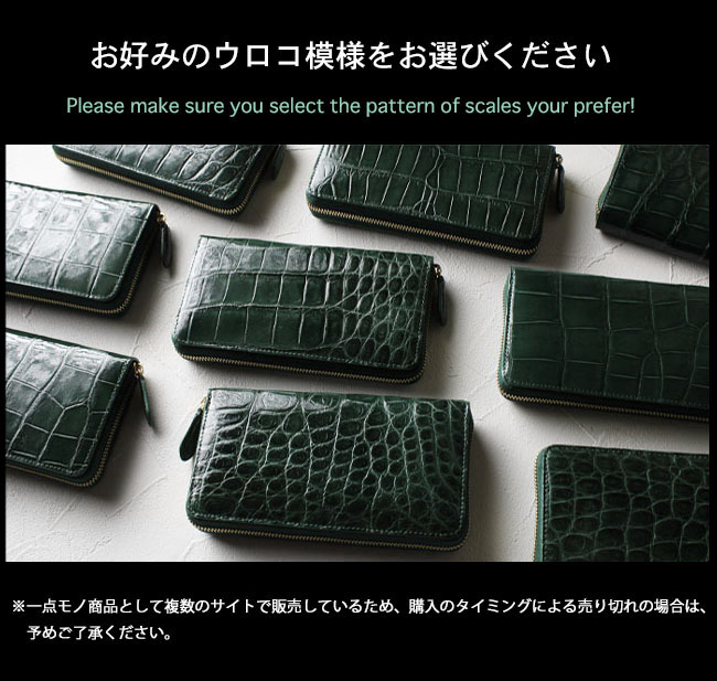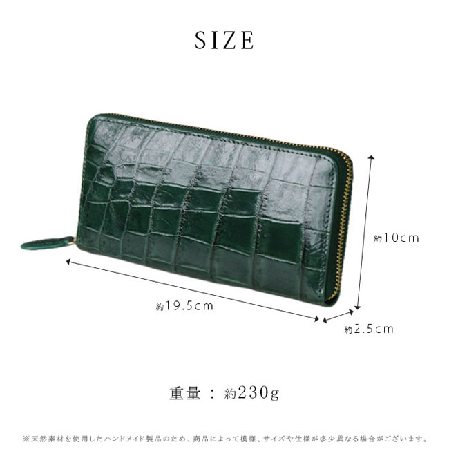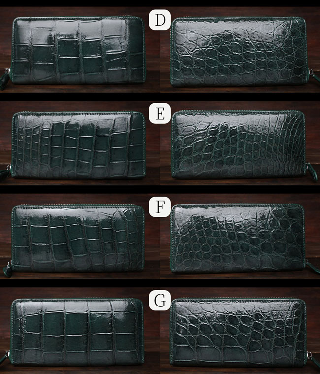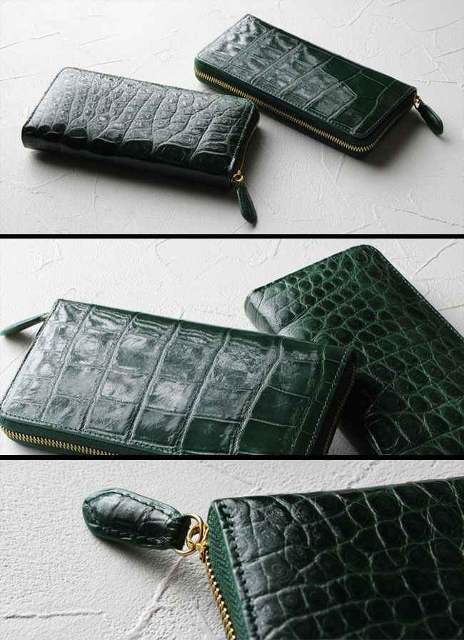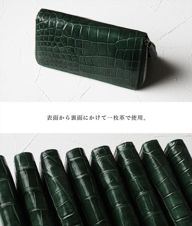 贅沢にクロコダイルのお腹部分を一枚革で使用した、深緑に染め上げられたラウンドファスナー長財布です。