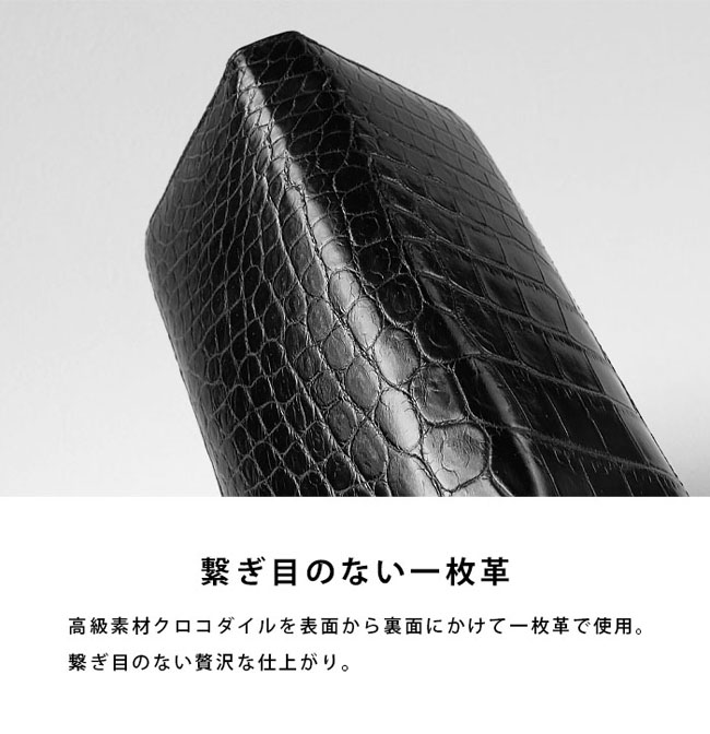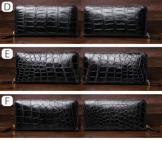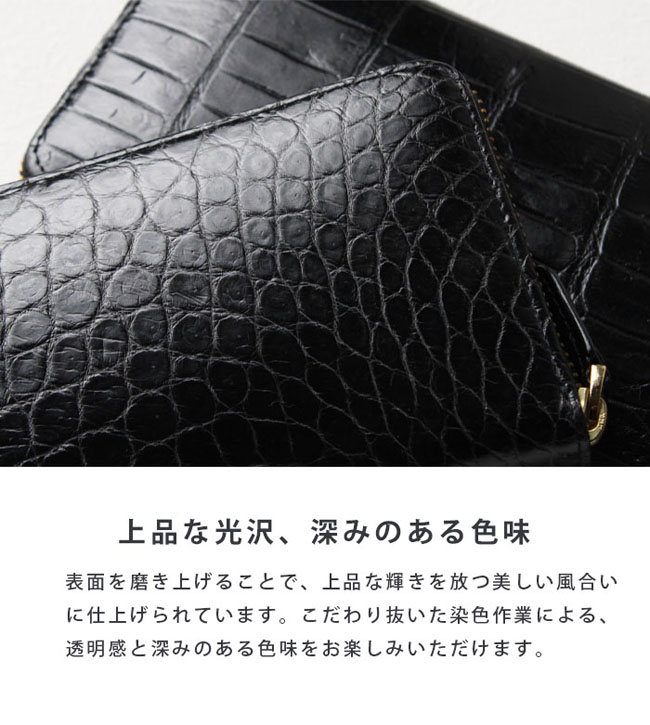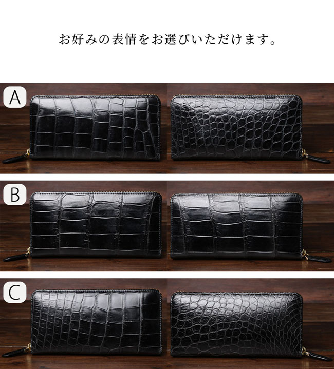 鱗模様が美しい高級感のあるクロコダイルのベリー(腹部の革)を全面に使用したラウンドファスナー長財布です。つなぎ目の無い一枚革を使用しています。