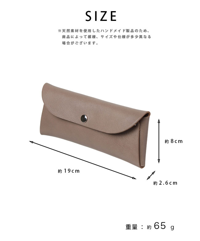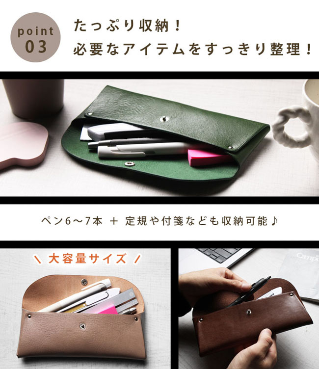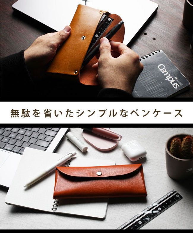 必要最低限の文房具をすっきりと収納できるサイズ感で、革素材の魅力を存分に楽しめるシンプルなデザインです。
