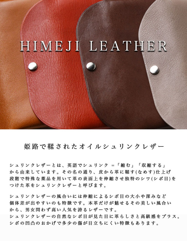 タンニン鞣しのオイルシュリンクレザーは、手にしっとりと馴染み、使い込むほどに色艶や表情が深まり、自分だけの一品へと育っていきます。