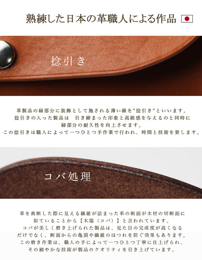 製作は日本の職人による手作業。革の縁の捻引きやコバ磨きなど細部に至るまで丁寧に仕上げられています。