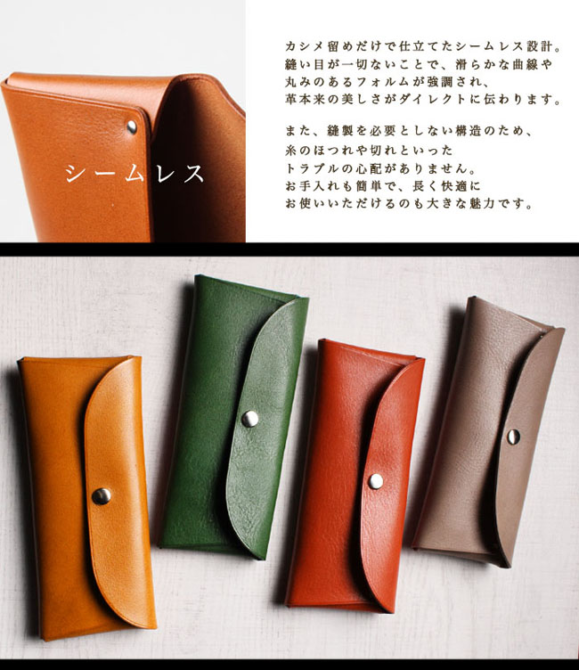 縫い目を一切使用せず、カシメ留めだけで仕上げたシームレス設計。