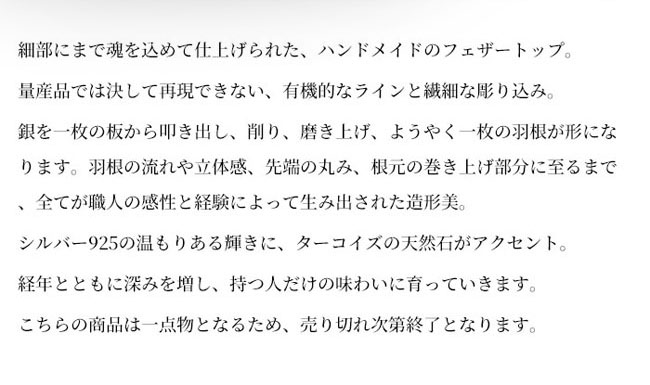 量産品では再現できない、有機的なラインと繊細な彫り込み。銀を一枚の板から叩き出し、削り、磨き上げ、ようやく一枚の羽根が形になります。