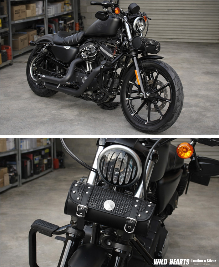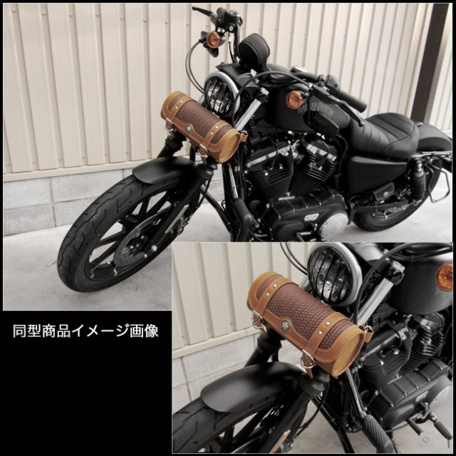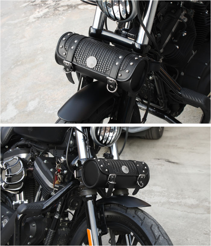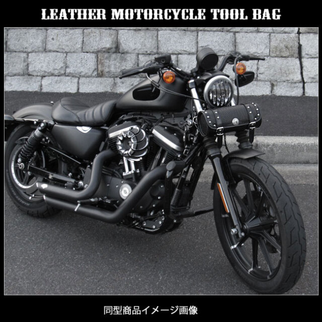 牛革のバイク用レザーツールバッグです。バスケット模様がお洒落な本革ツールバッグとなります。コンチョとカバーの周りにスタッズをあしらいました。革職人によるオールハンドメイド/手作り商品となります。