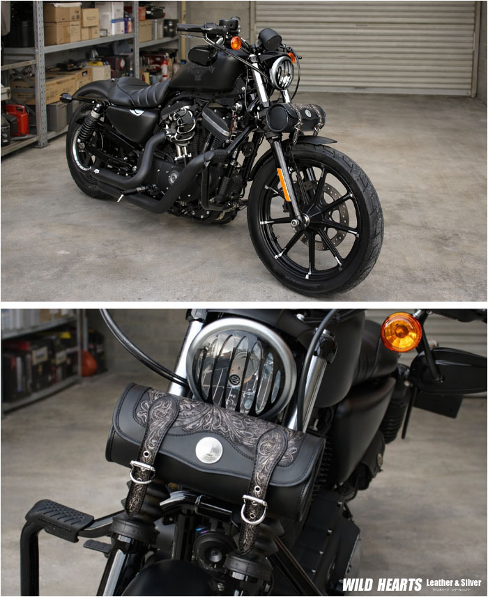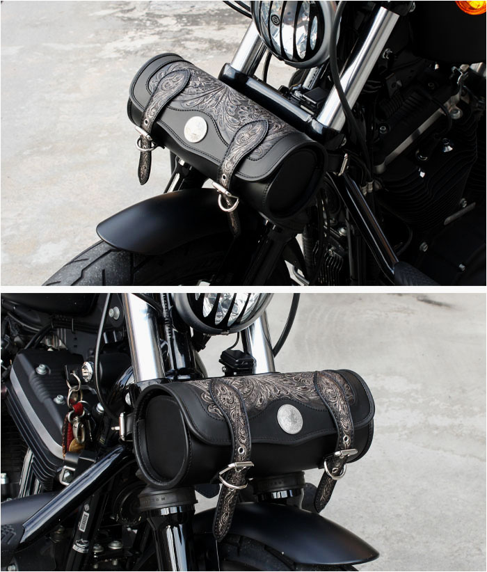 牛革のレザーバイク用ツールバッグです。カバー部分とベルトにカービングをあしらっています。革職人によるオールハンドメイド/手作り商品です。
