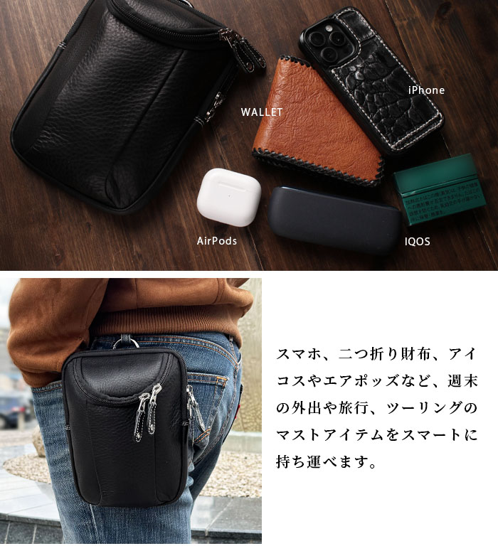 スマホ、二つ折り財布、アイコスやAirPodsなど、週末の外出や旅行、ツーリングに欠かせない必需品をスマートに持ち運べるコンパクトサイズのベルト(ウエスト)ポーチです。