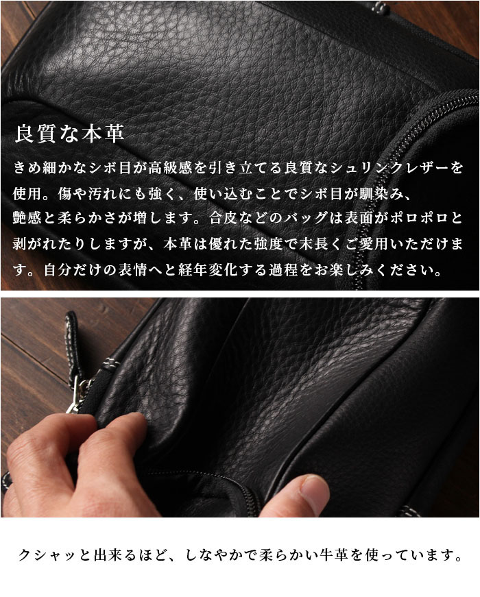 素材には、柔らかな肌触りと高級感を兼ね備えたシボのある上質な牛革を採用。しっとりと手に馴染む質感は、使い始めから心地よさを実感できます。